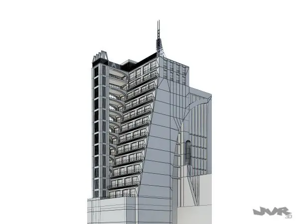 The model represents one of the draws made by Antonio Sant'Elia in 1914 for the Cittá Nuova New city. In this case it is a terraced building with external elevators and it was part of the exhibition of the Nuove Tendeze group, of wich he was a member. Sant'Elia died at 1916 when he was only twenty eight years old, however his drawings influenced many architects and designers along the time.