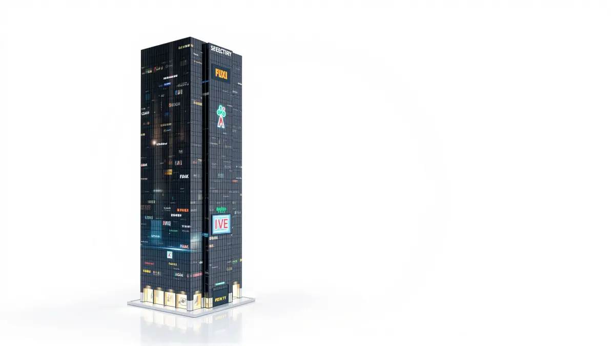 The futuristic skyscraper with mirrored glass is adorned with neon advertising elements, creating a play of light and reflections. Ideal for urban scenes, futuristic cityscapes, architectural visualizations, and night-time environments.