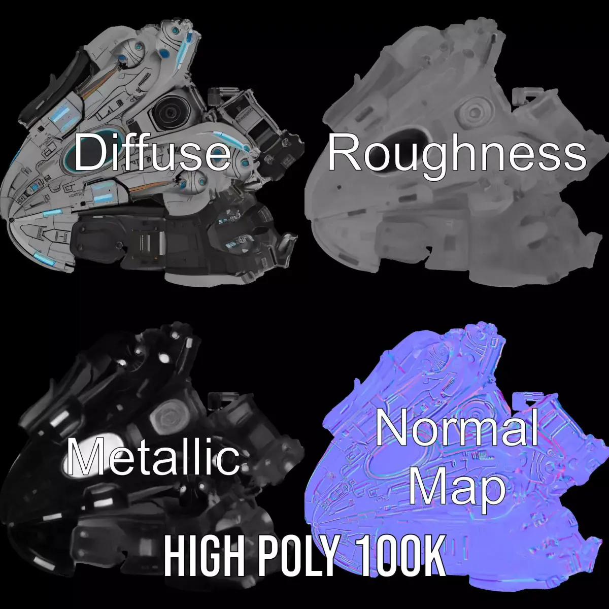 The futuristic spacecraft model pack offers a sleek design perfect for sci-fi projects. Each model has 3 levels of detail: low-poly (1000 triangles for mobile), middle-poly (10,000 triangles for environment), and high-poly (100,000 triangles), which allows for the use of this model in production rendering (such as 3ds max, Maya, Cinema4D, Blender, Vray/Corona/Cycles and all other), game engines (Unity and Unreal compatible), and interactive presentations, providing a choice of detail based on the LOD System principle. Ideal for space-themed games, animations, and VR projects. Models feature emissive lights and intricate surface details. The model's textures are PBR, Diffuse, NormalMap, and reflection/roughness/metallic, which are suitable for any modern rendering engine. All models accurately unwrapped and have no overlapping UV. All textures are 4096*4096 in size. The first image is the reference used for creating the 3D model. It is important to carefully evaluate the quality of the model by examining the preview images that display the topology and polygonal mesh. These previews (WIRE and WEB 3D Preview) clearly demonstrate how accurately the model matches the original reference and how well the geometry has been executed. Please like and leave a comment for the model if you enjoyed it.