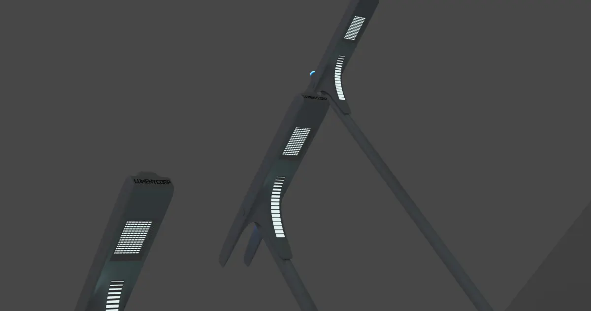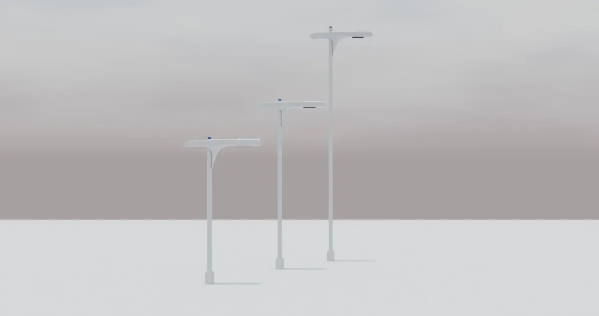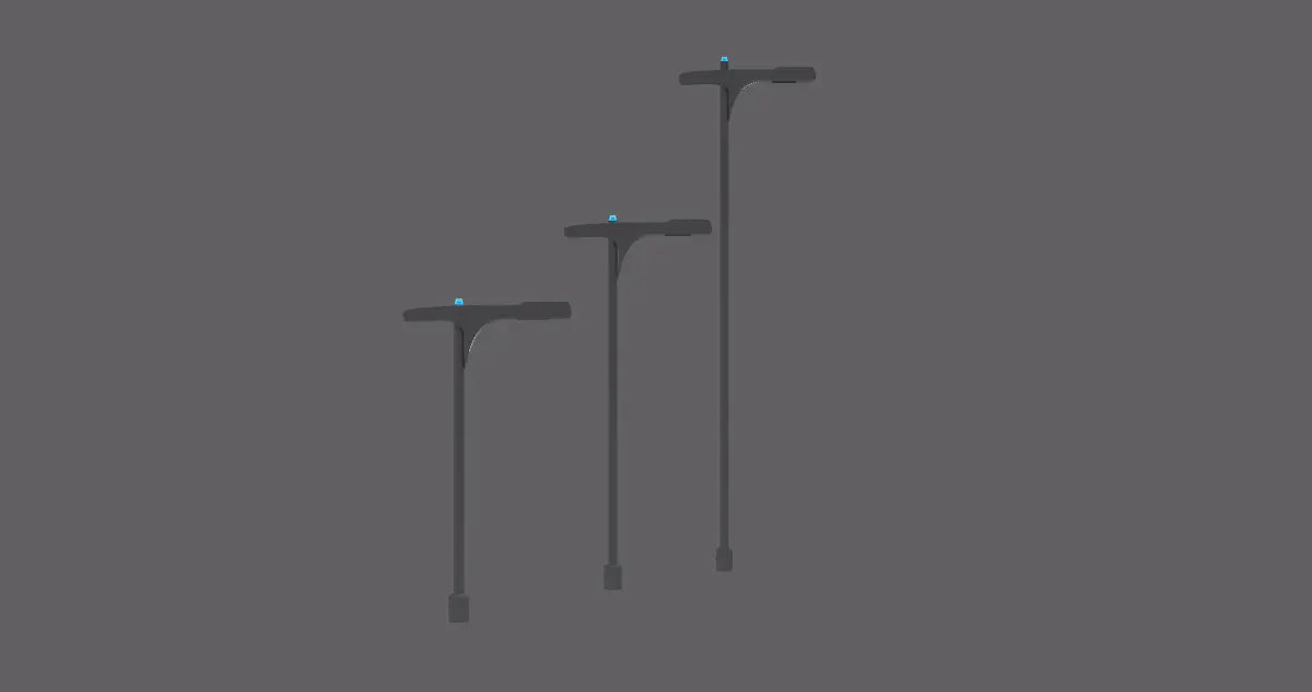 This is a 3D model of street lamps with a modern and minimalist design. Each lamp post featuresSleek Vertical Poles The poles are thin, straight, and uniform in color, giving them a contemporary and elegant appearance.
