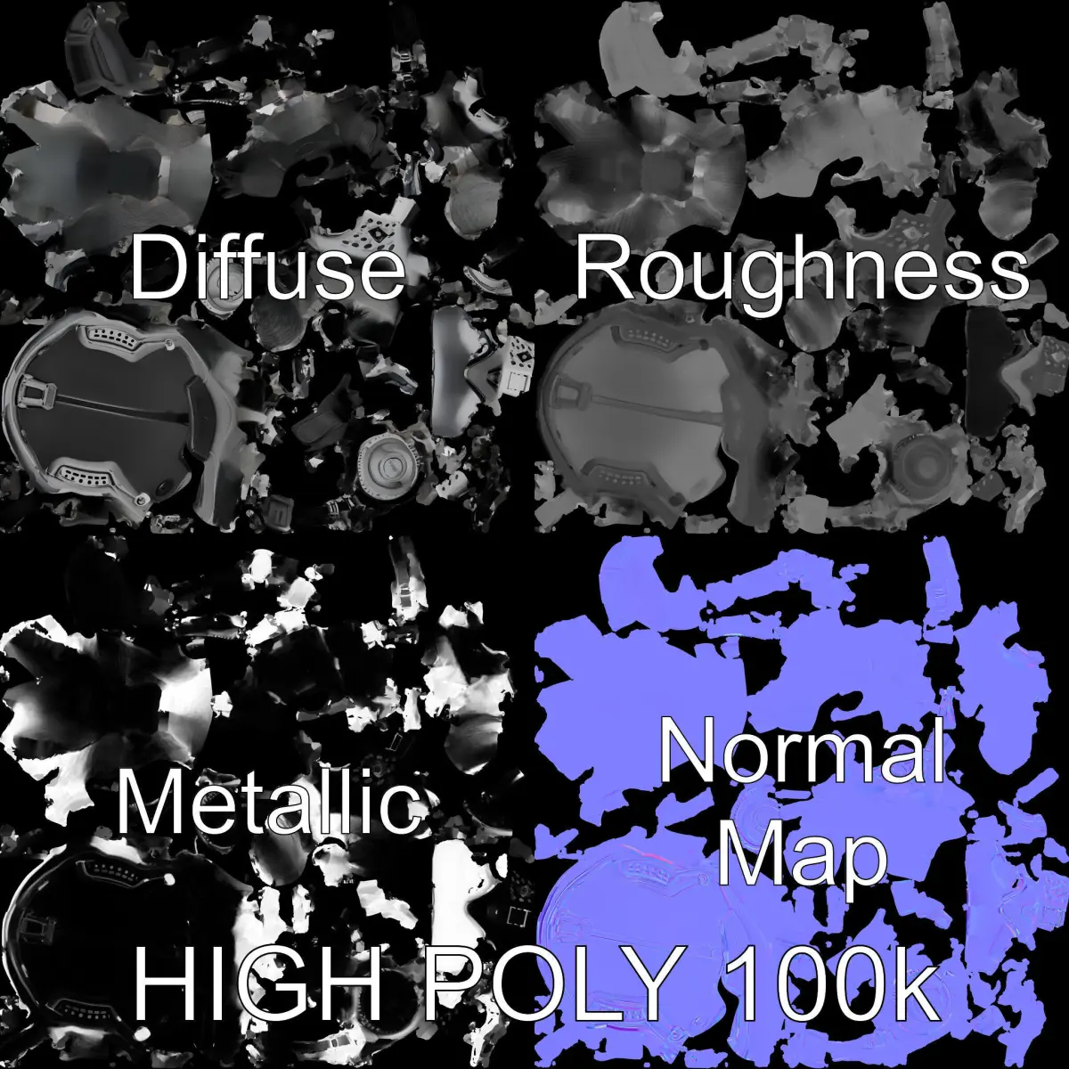 This 3D model pack offers a highly detailed futuristic tactical helmet with three levels of detail: low-poly for mobile applications, middle-poly for environment settings, and high-poly for production rendering. Ideal for use in games, simulations, and virtual reality applications due to its advanced design and functionality. Featuring PBR textures including Diffuse, NormalMap, and reflection/roughness/metallic, this model ensures compatibility with modern rendering engines like Vray, Corona, and Cycles.