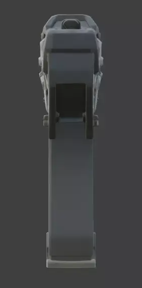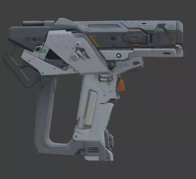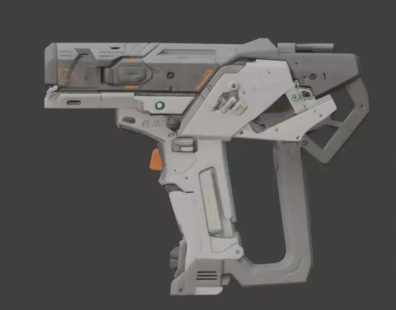 The design highlights a robust, compact chassis featuring a large front-facing optical lens, an ergonomic rear grip with a textured thumb rest, and an integrated orange tactical trigger. Its body includes complex mechanical detailing such as ventilation ports, mounting rails, and recessed sensor clusters. Engineered with an ultra-efficient low-poly count under 5,000 polygons, this asset is perfectly optimized for real-time game engines, VR/AR applications, and high-performance mobile environments.