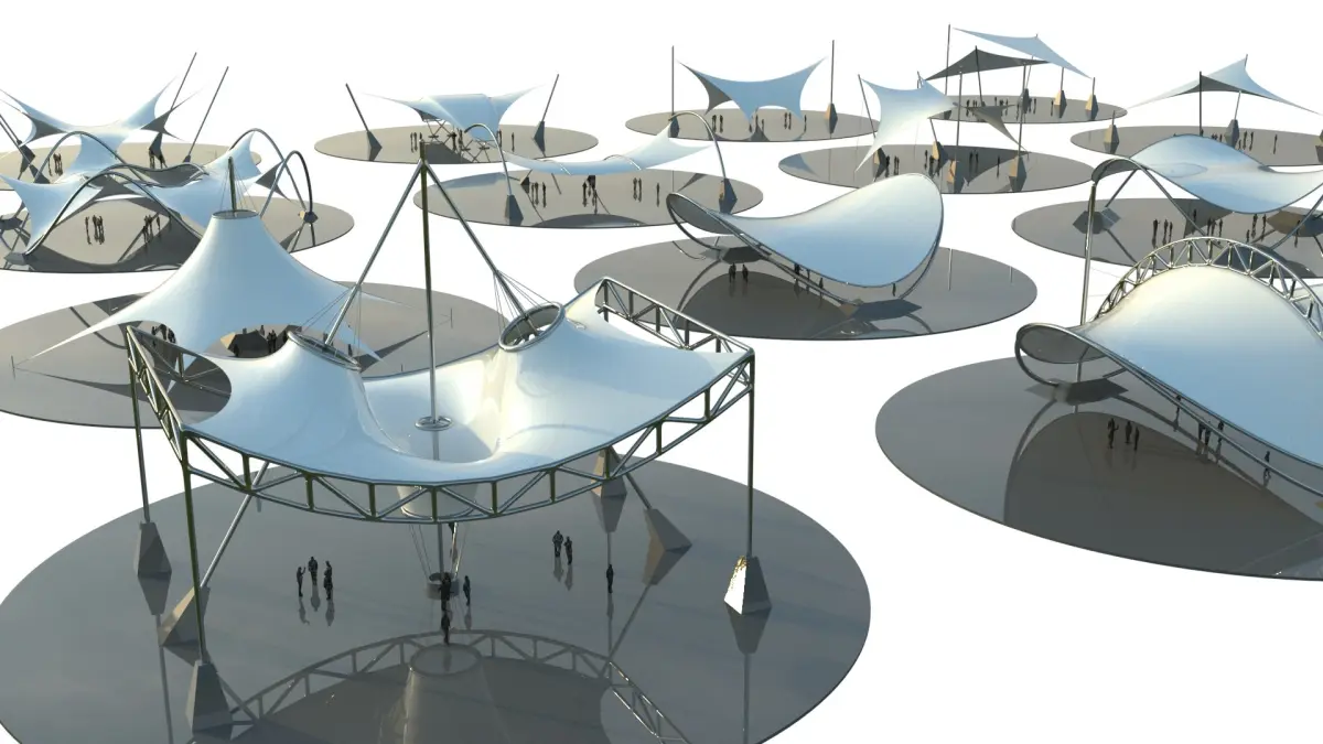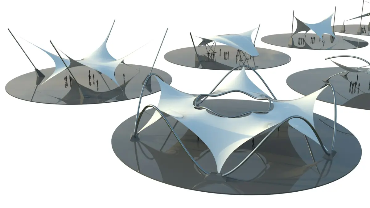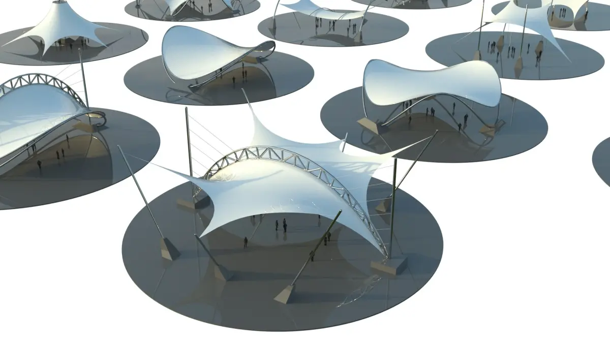 Those high-quality 15 3D models set present futuristic tensile pavilions with a sleek, aerodynamic canopy design ideal for architectural visualization, public space concepts, and conceptual urban environments. The models features a dynamic, flowing fabric-like roof structures supported by tension cables, steel poles anchored into heavy concrete bases over circular platform. Human figures are included for scale and context.