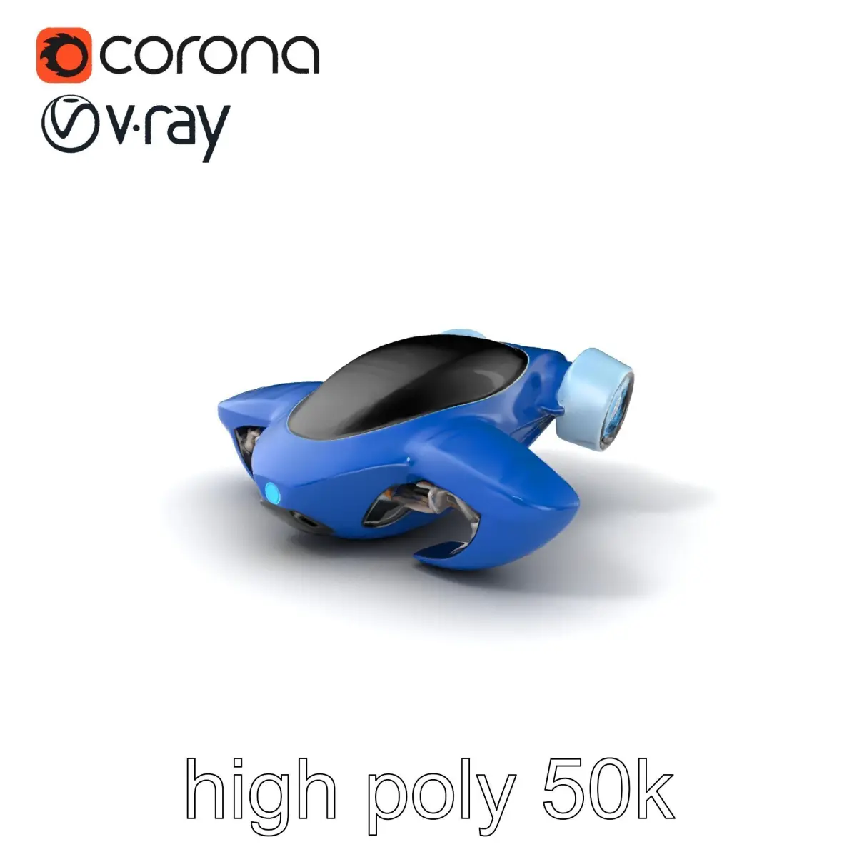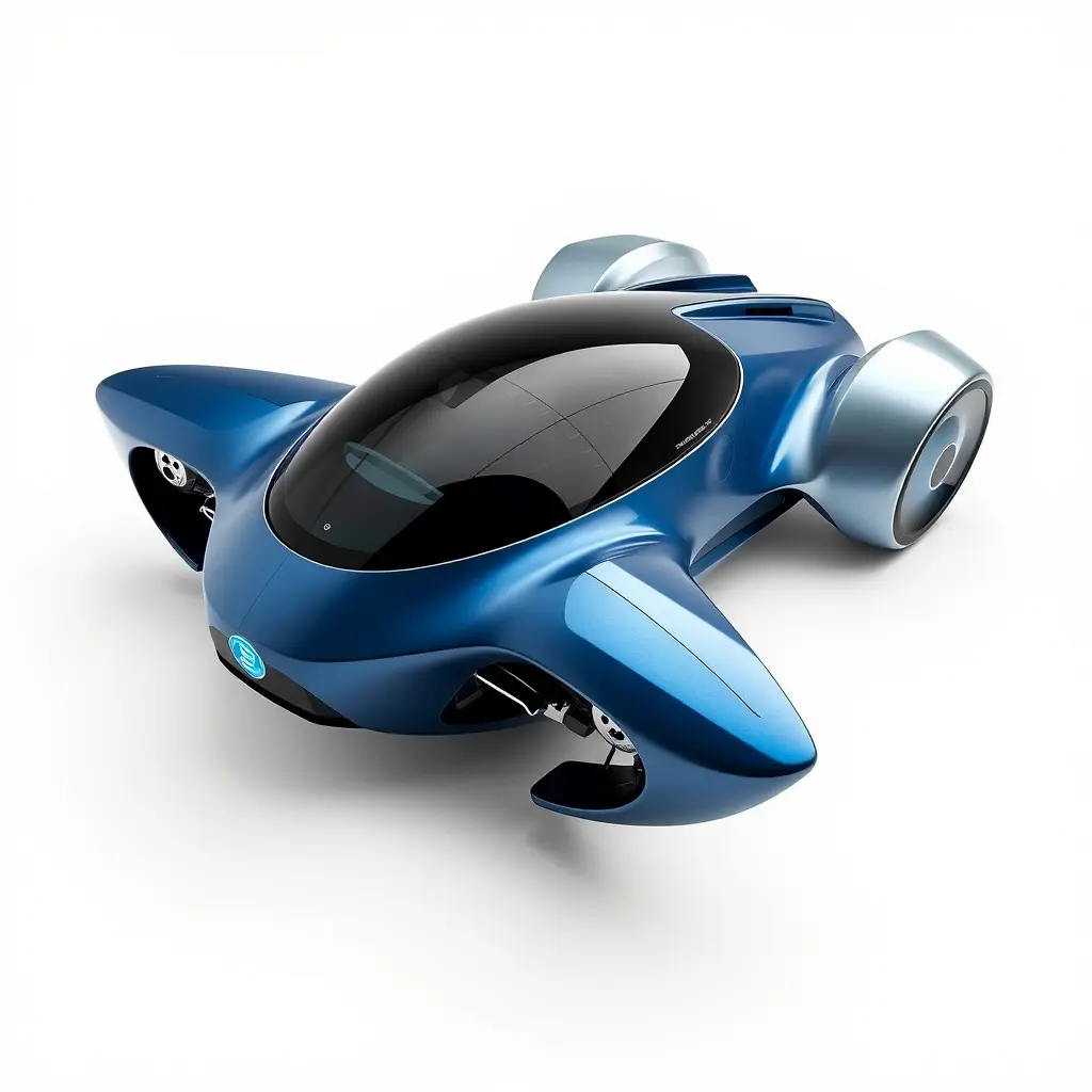 This futuristic urban flying car features a pod shape, deep blue and silver detailing, and a plasma propulsion system. Its sleek, aerodynamic edges and ultra-reflective windows make it lightweight and highly efficient, ideal for showcasing advanced technology in cinematic visualizations or game scenes set in a futuristic environment.