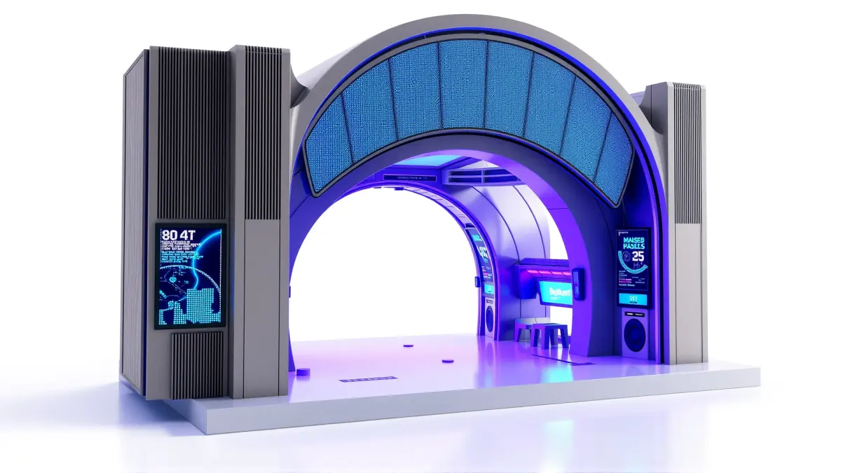Perfect for enhancing futuristic cityscapes in animations, games, or virtual reality environments. This model is characterized by its sleek design with massive arches, digital panels, and neon lighting in cool blue and purple shades.