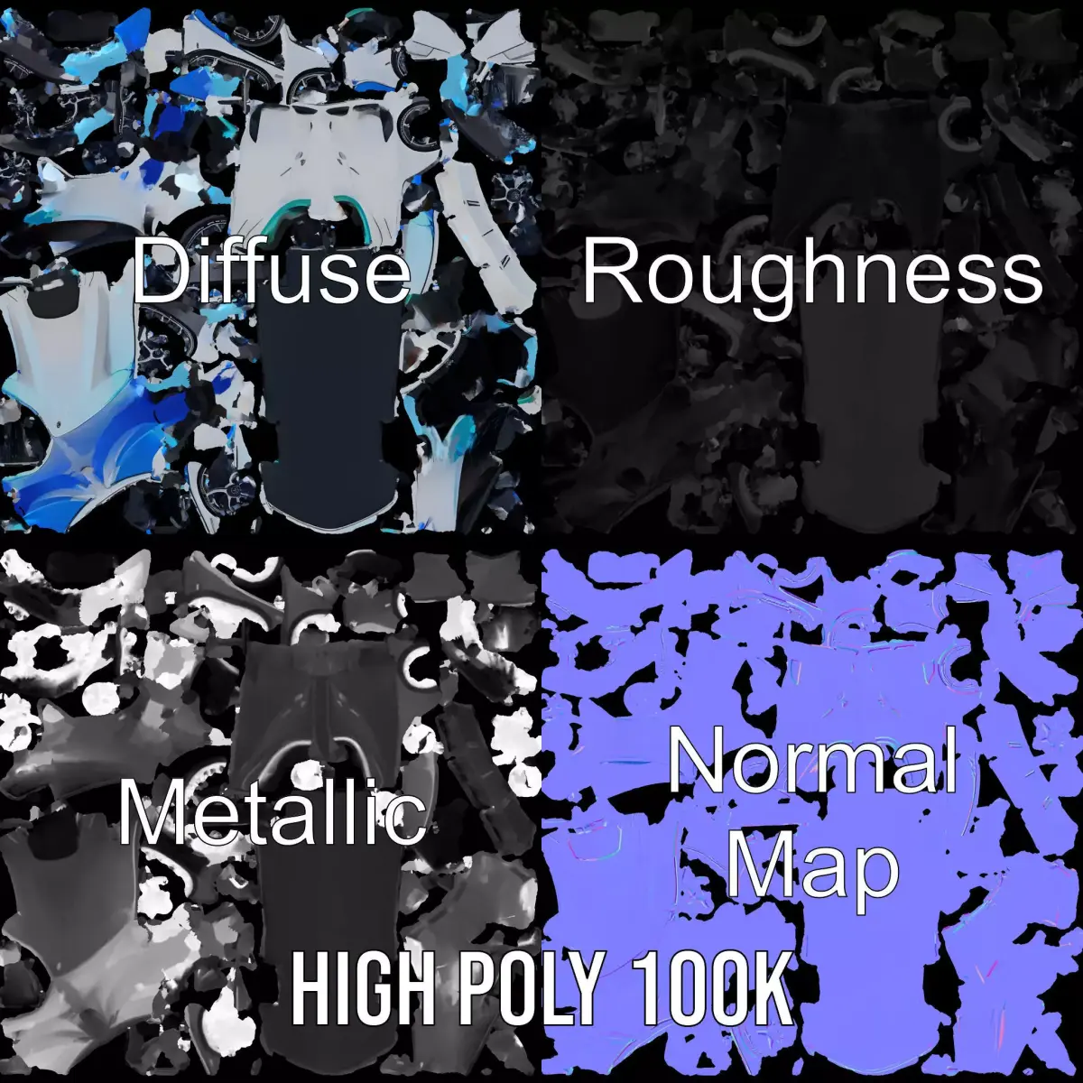 This futuristic white racing car model boasts sleek aerodynamic lines and vibrant blue accents, ideal for both sci-fi settings and high-speed chases. Each model has 3 levels of detail: low-poly (1000 triangles for mobile), middle-poly (10,000 triangles for environment), and high-poly (100,000 triangles), which allows for the use of this model in production rendering (such as 3ds Max, Maya, Cinema 4D, Blender, Vray/Corona/Cycles and all other), game engines (Unity and Unreal compatible), and interactive presentations, providing a choice of detail based on the LOD System principle. Perfect for futuristic simulations and games. The model's textures are PBR, Diffuse, NormalMap, and reflection/roughness/metallic, which are suitable for any modern rendering engine. All models accurately unwrapped with no overlapping UVs. All textures are 4096*4096 in size. If you like this model, please leave a comment and like it.