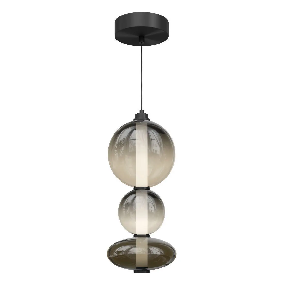 The Futuro series is a captivating collection of pendant and floor lamps that stand out with their bold, futuristic design. Featuring blown glass lampshades with a unique, airy form, the Futuro lamps evoke the technology of tomorrow while seamlessly blending into minimalist modern interiors. The blown tinted glass, available in smoky gray or amber, offers a mesmerizing gradient effect that transitions from opaque to nearly transparent, creating the illusion that the lamps are floating.