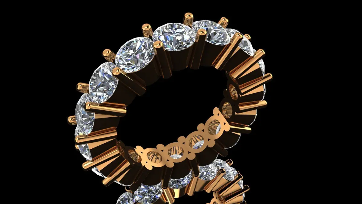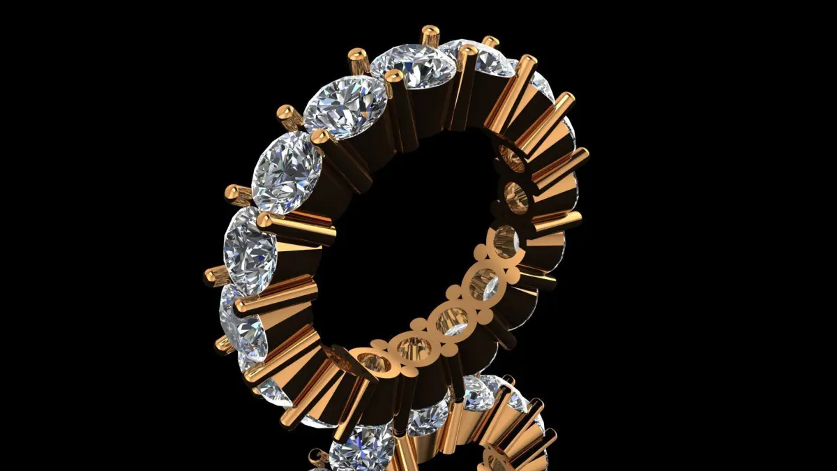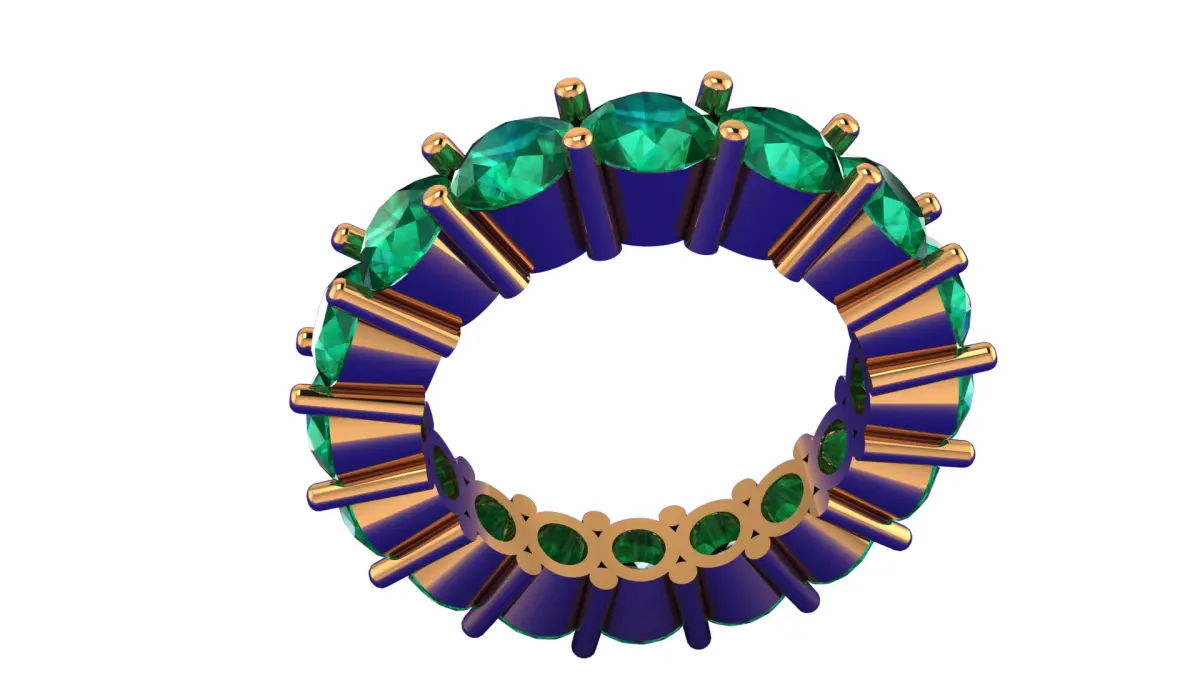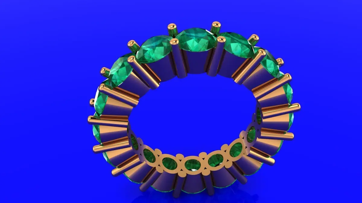 This 3D model showcases a sophisticated full eternity ring designed with a seamless row of vibrant round-cut emerald gemstones. Each gem is meticulously set within a polished gold framework, allowing for maximum light reflection and a continuous display of color. The smooth inner profile ensures comfortable daily wear. This model is ideal for creating a high-demand, elegant piece.