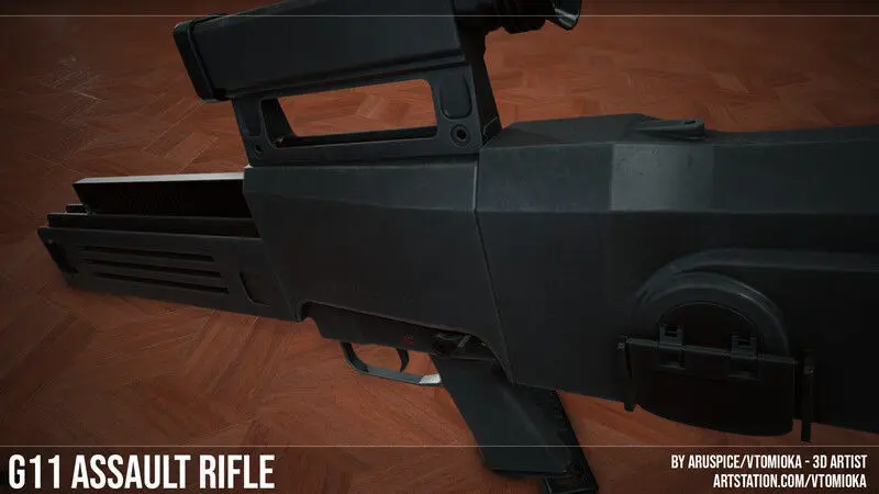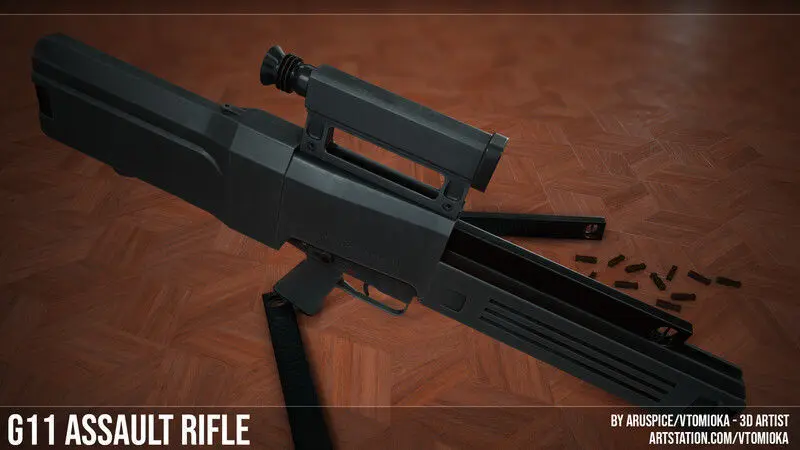 H & K G11 prototype assault rifle. Has a magazine and projectile models. Modeled in Maya and Zbrush. Textures in Substance Painter.