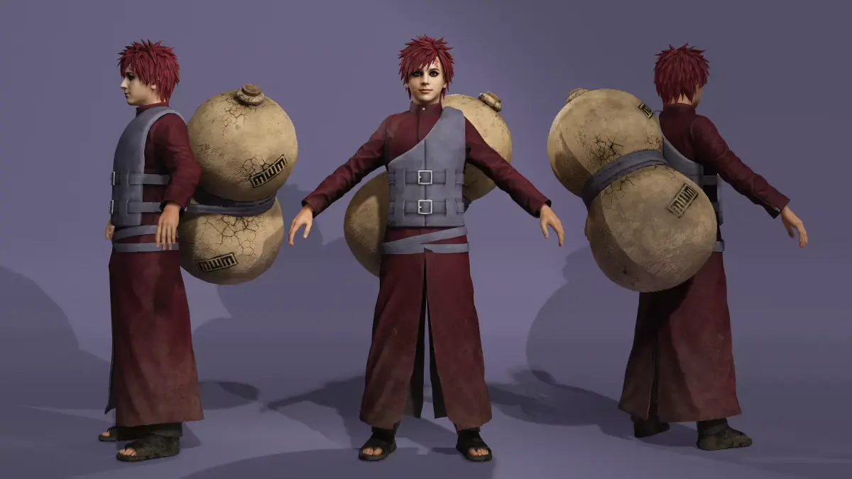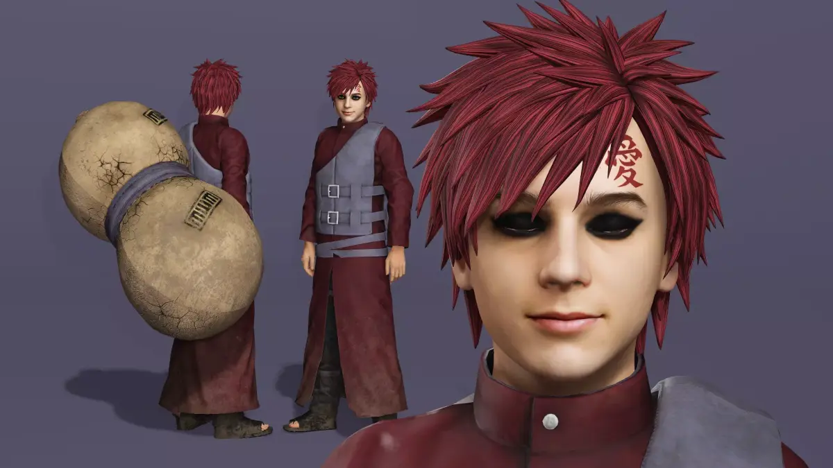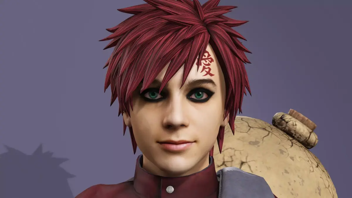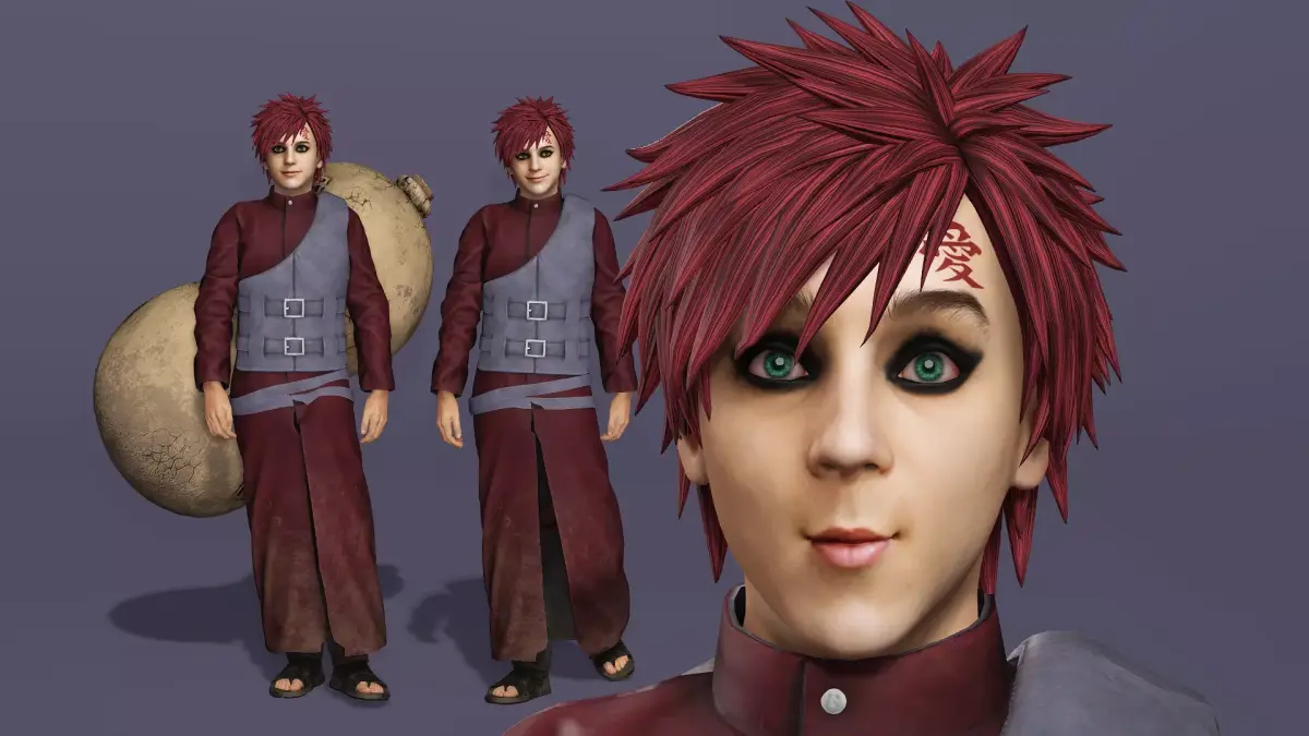 这是一款写实风格的我爱罗3D模型,高度还原《火影忍者》中经典造型:冷峻的表情、标志性的红发与眼圈,以及背负巨大的沙葫芦。