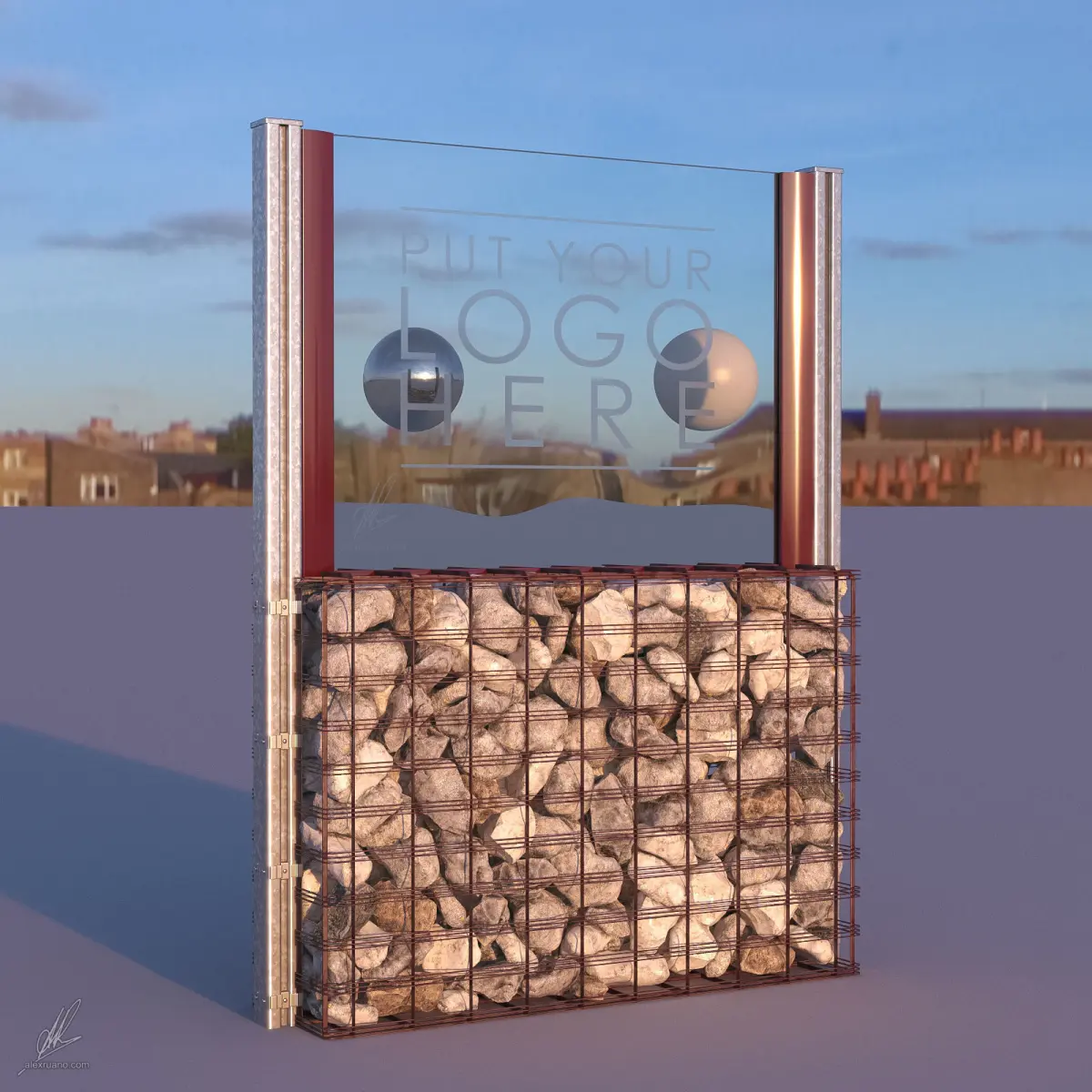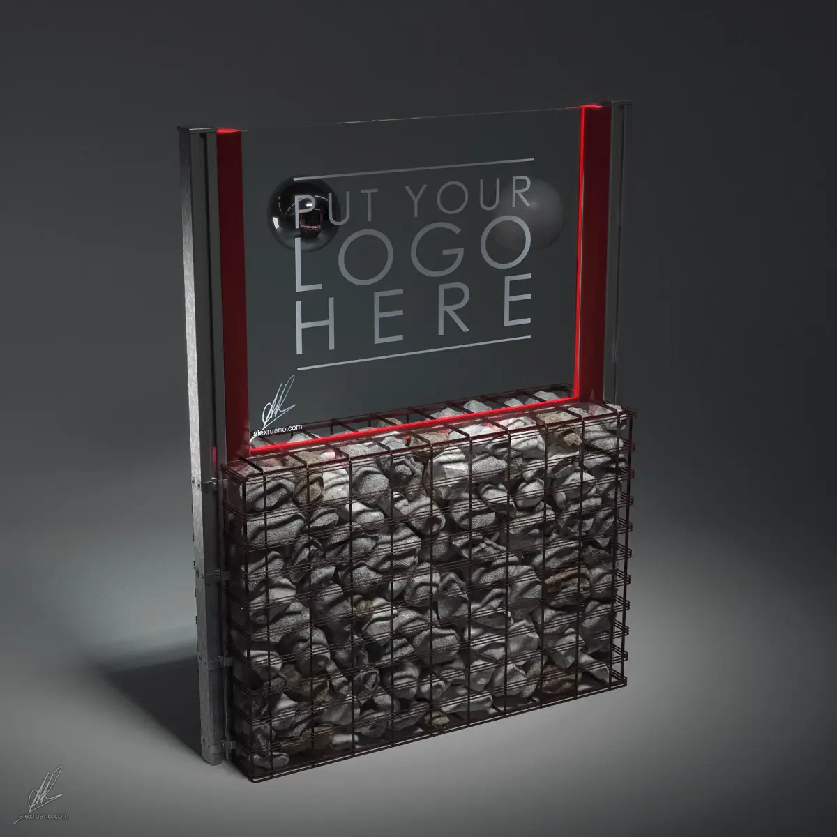 Gabion basket sized 100X140X30cm containing average sized randomly ordered rocks and boulders.It is intented to be used in public spaces such as bars with outdoor seatings / patios. Hence the logo on the glass.