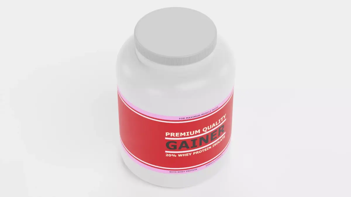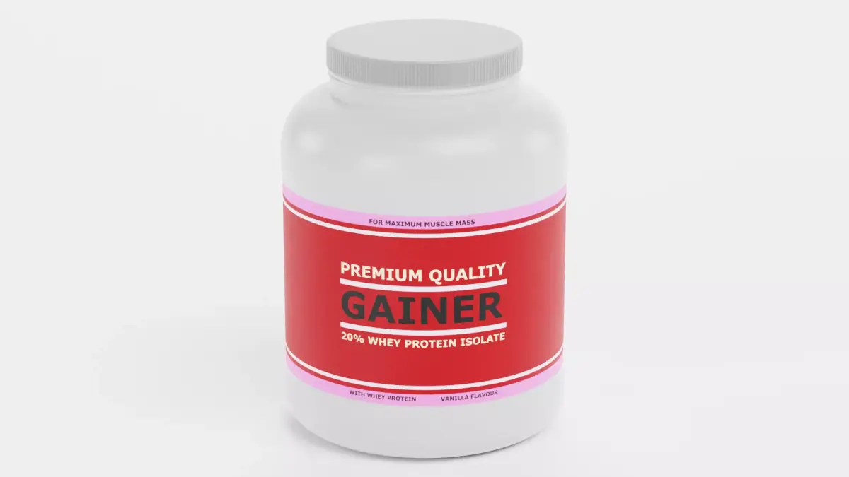 A realistic 3D model of a screw-top Gainer Product container designed as a brand-neutral supplement container with clean proportions and a production-ready look. This concept emphasizes modern, minimal design and accurate form factor, representing a timeless, professional packaging aesthetic for sport nutrition packaging – without any brand association.