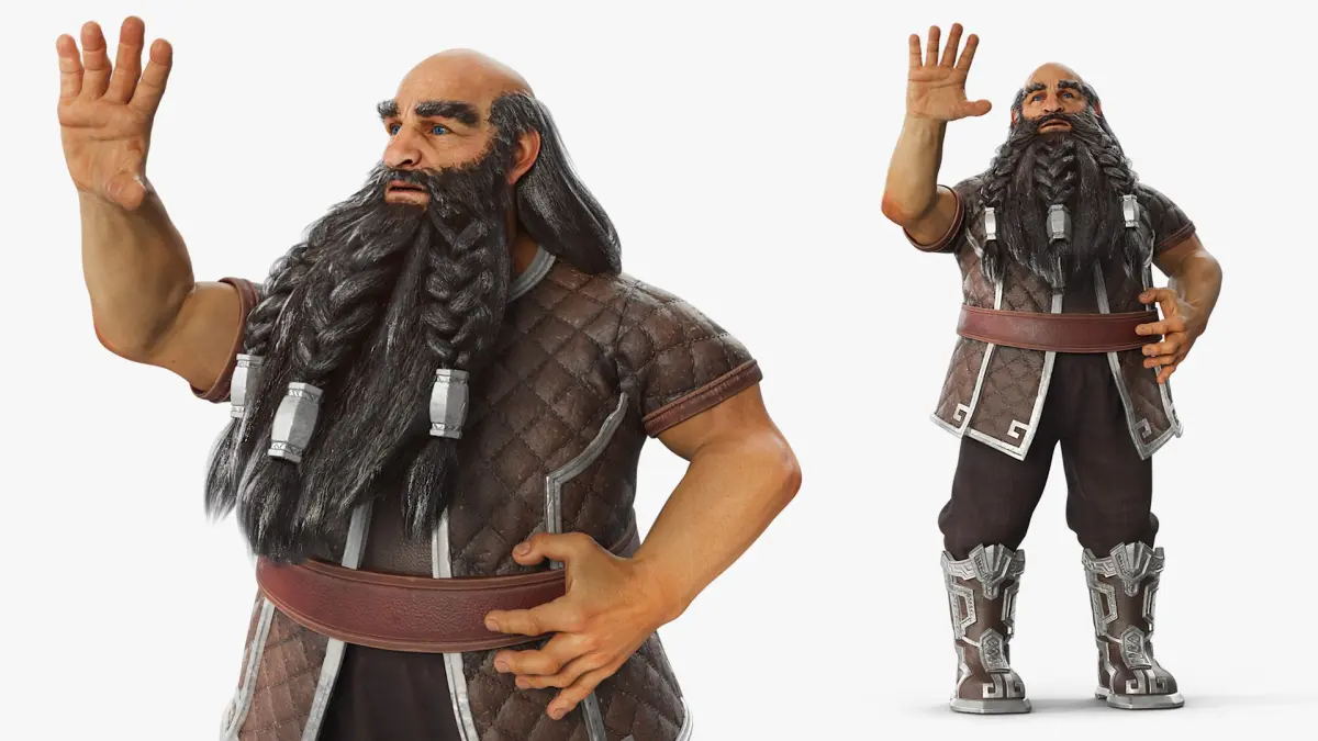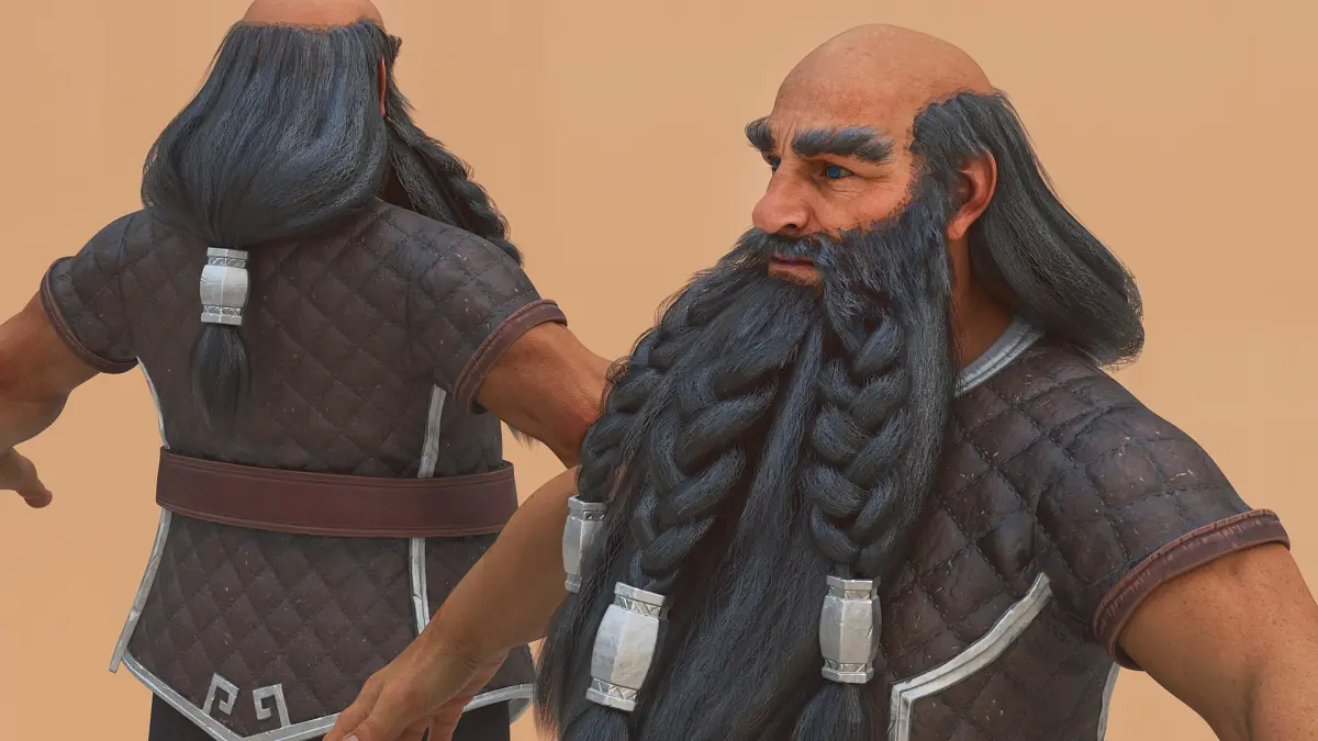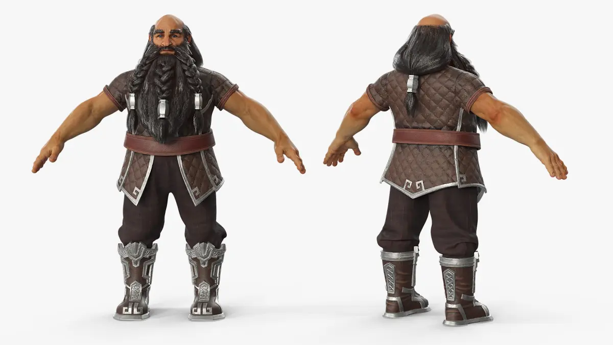 The armor includes metallic accents on the boots and belt, offering a blend of strength and elegance typical of fantasy worlds. The character’s rugged appearance and sturdy build are matched by carefully crafted textures that highlight the craftsmanship of the outfit. This model features a stocky figure with a long, braided beard, clad in detailed armor with quilted patterns.