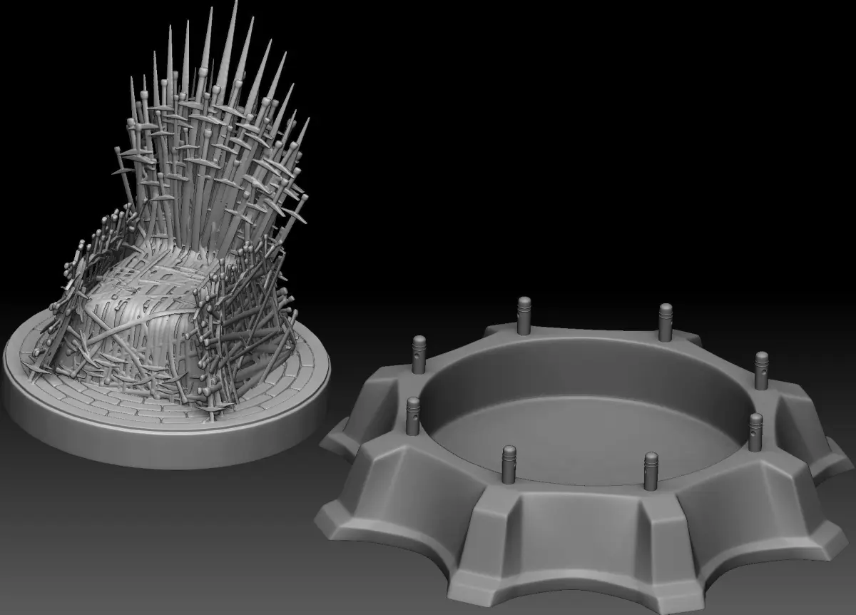 The throne and the base are separated.There is an all in one stl file too which includes the base and the throne.Included the low poly dynamesh model, and the high poly model.Enjoy