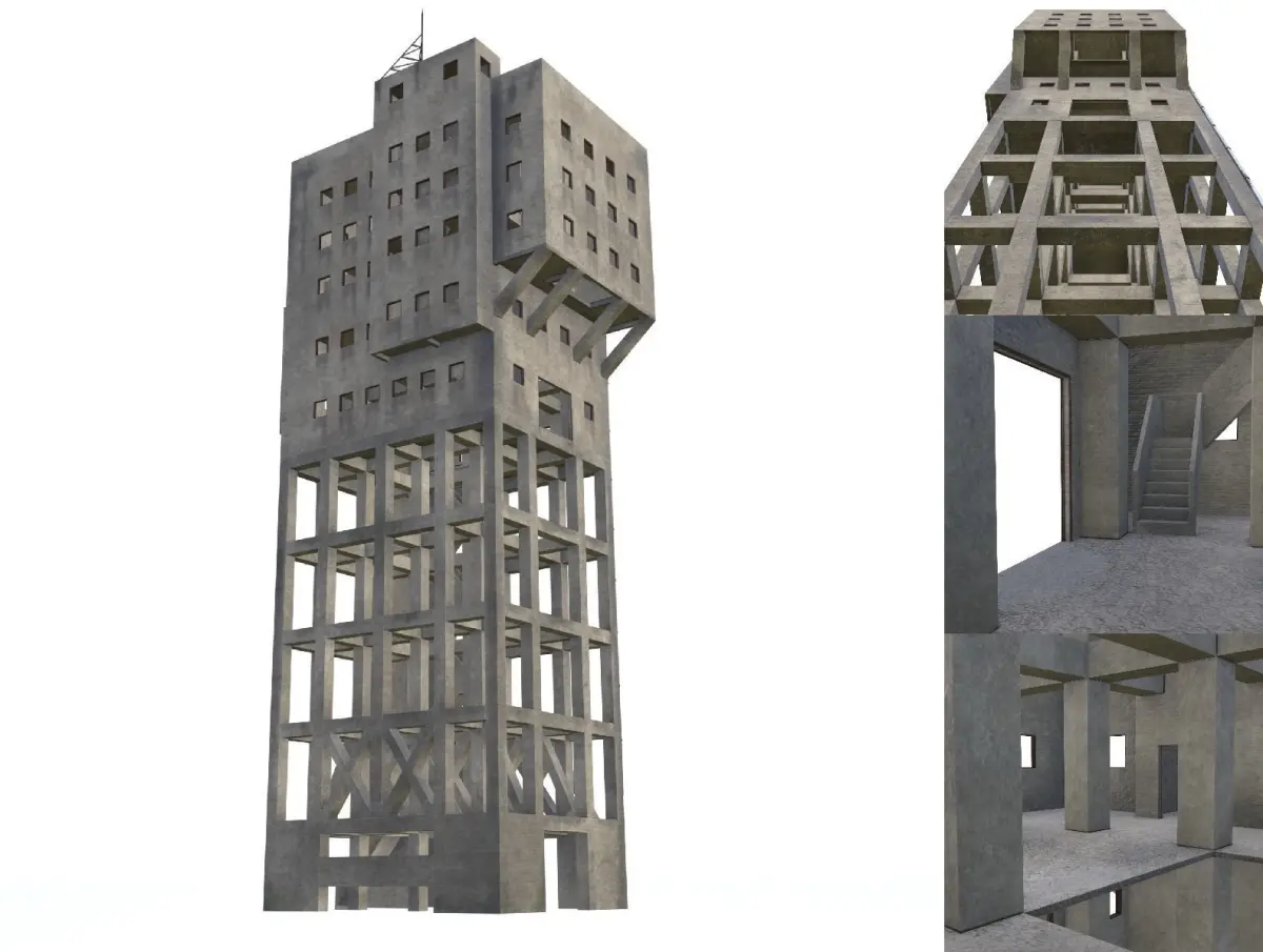 Shime coal mine winding tower - also known as **Anti-Zombie Fortress** is an famous real life object located in Japan. I tried to match its original design as much as possible. The model includes interior as well as exterior.Dimensions are real: height is 47,65m (52,70m including the iron tower on the top)