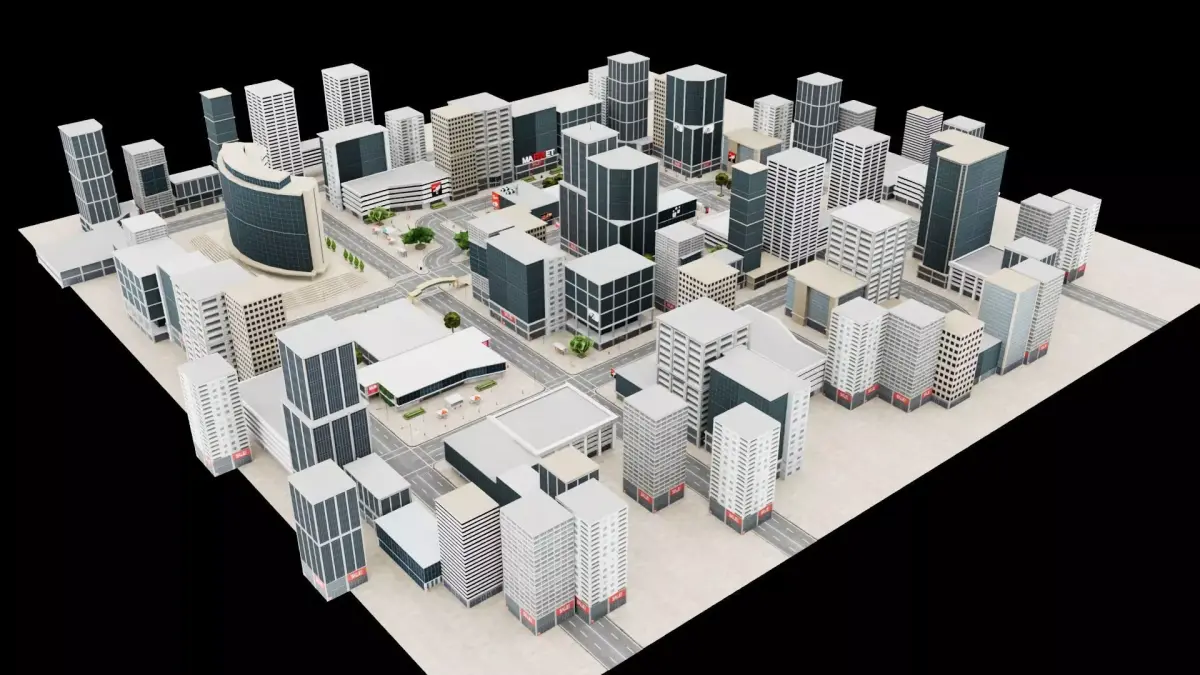 It includes skyscrapers, roads, street elements, and modern buildings arranged in a well-structured city layout.
