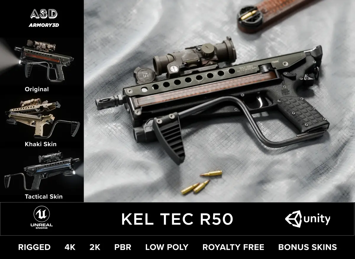 KelTec R50 SMG: This powerful, high-capacity submachine gun features a distinctive design, ensuring it stands out in any cyberpunk setting. Ideal for players who prefer high firepower and quick reloads.