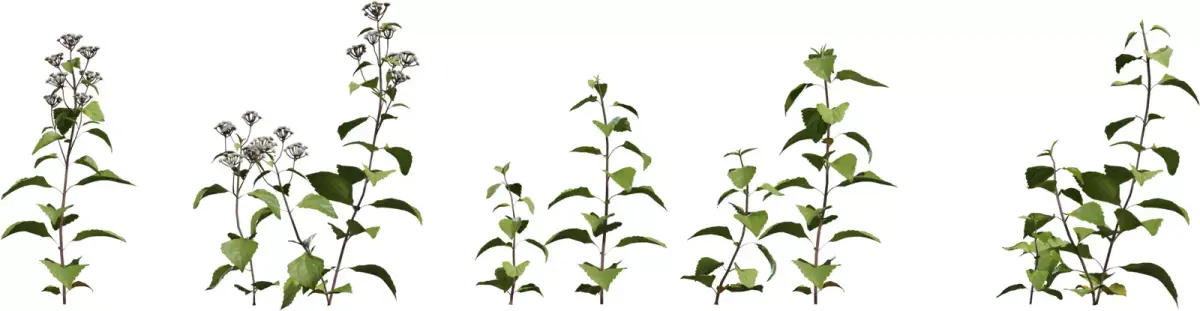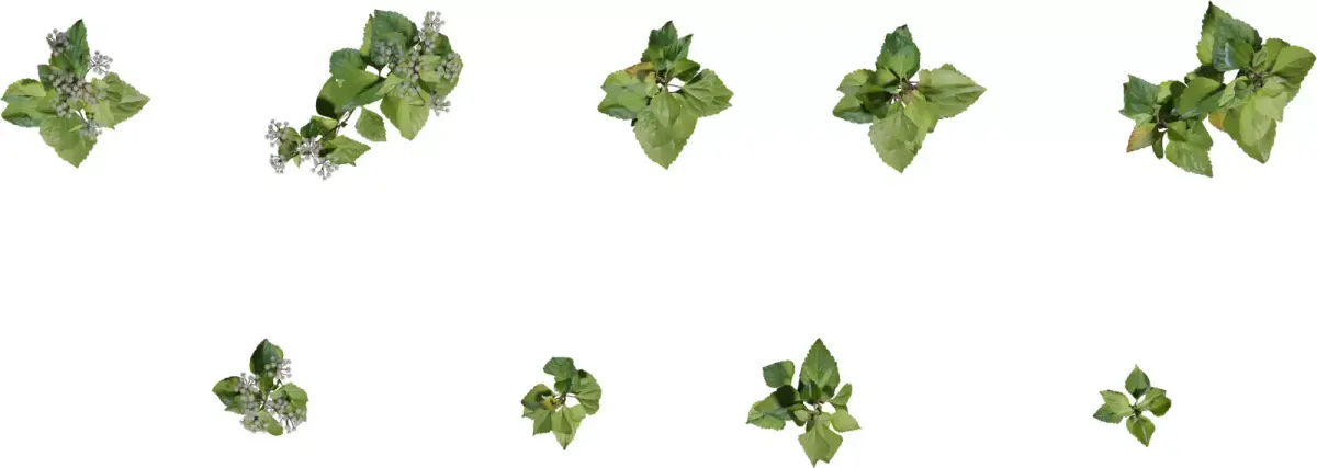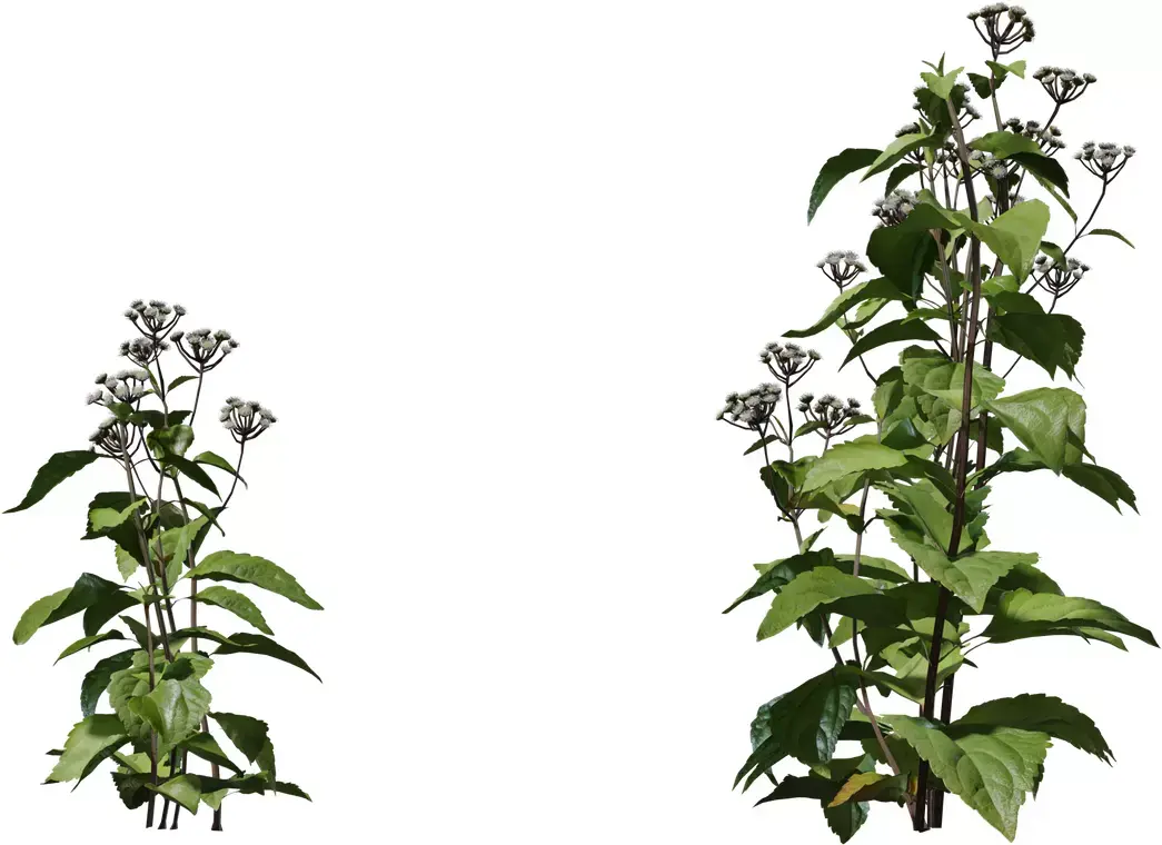 The set includes individual flowering weeds, young shoots and tall stems, plus dense clusters and overhead variations for natural scattering, ground cover and hero close‑ups. Conifer crowns rendered from a top view are ideal for level design, RTS games and landscape planning where believable tree canopies are needed from above. All models use PBR materials with color, roughness and opacity maps, making them easy to integrate into modern pipelines and game engines.