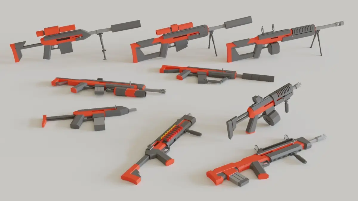 Low-poly game ready asset pack of 9 guns created in Blender 2.8. The set include: 3 assault rifles, 2 submachine guns, 1 shotgun, 2 sniper rifles and 1 light machine gun.