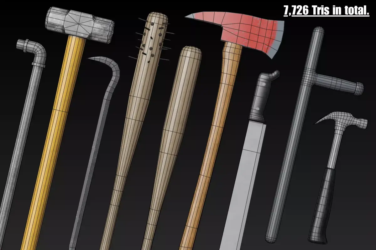 Game-Ready Melee Weapons Pack for Unity & UnrealA versatile set of 9 optimized melee weapons designed for FPS, survival, post-apocalyptic, and VR titles. All assets come ready to drop into your project with consistent scale, PBR textures, and engine-friendly formats.