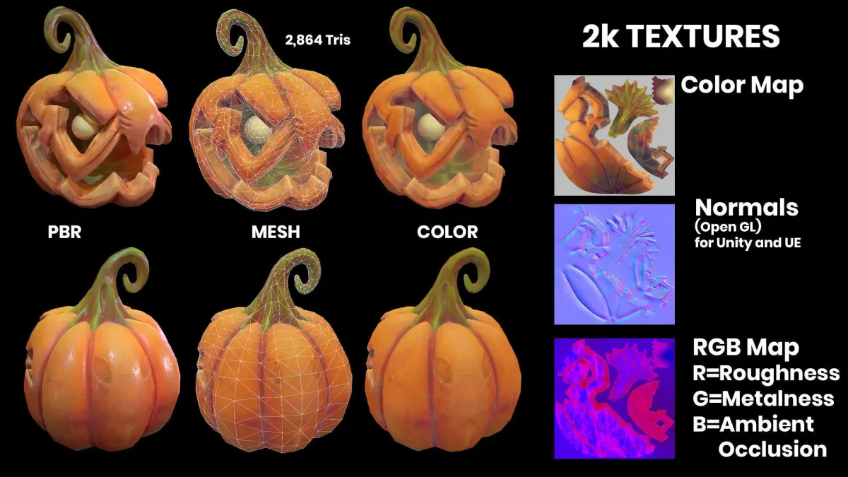 - Pumpkin_NRM.tga: Normals map in OpenGL format for correct display in Unity and Unreal.