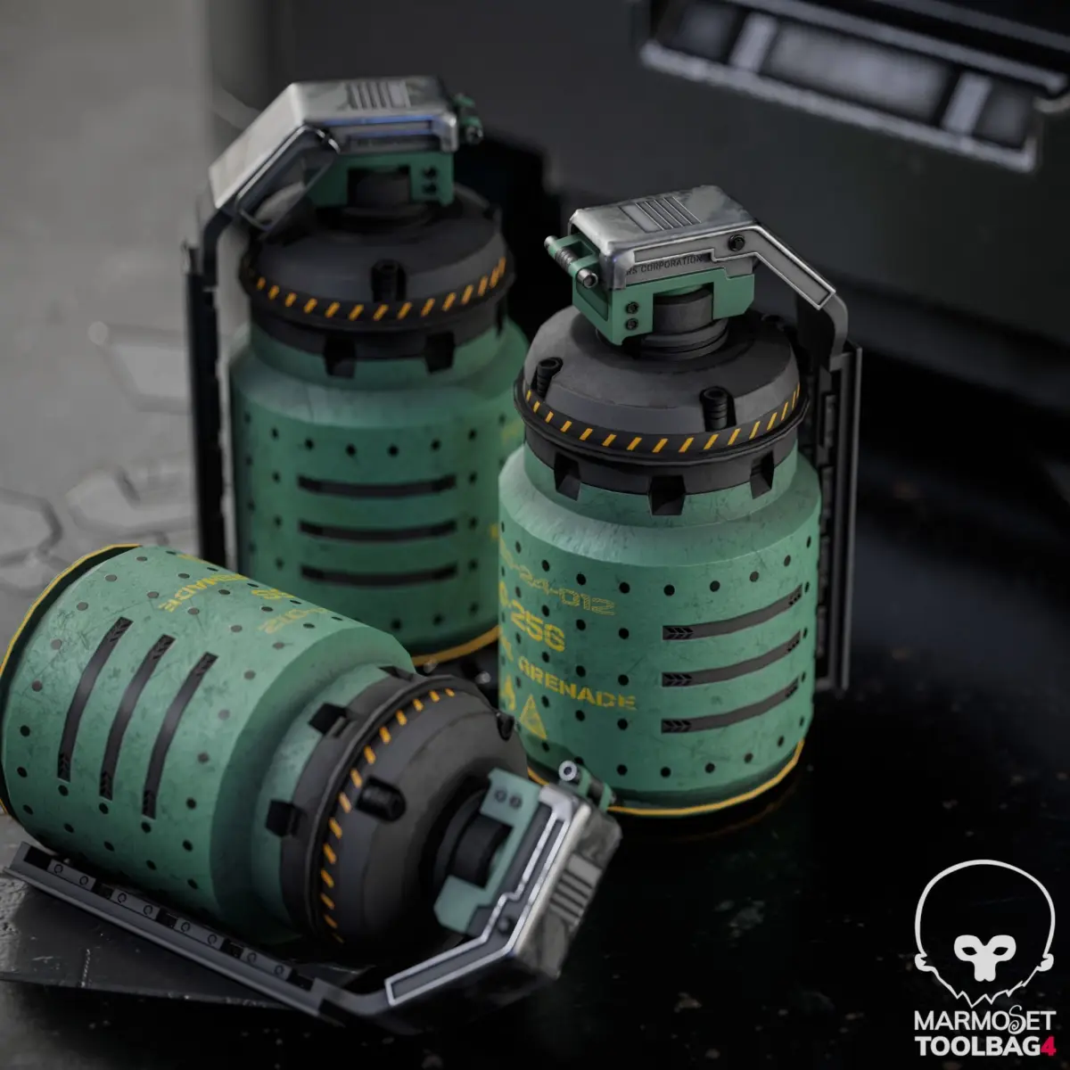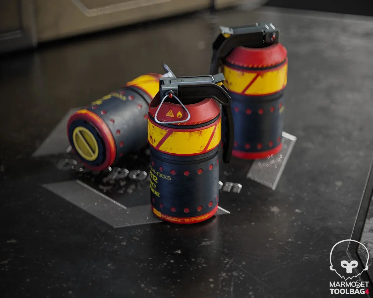 Specification:Explosive grenade:Poly:2552 Tris:4978 Texture: 1 Set 2kSmoky grenade:Poly: 2560 Tris: 4985 Texture: 1 Set 2kFlashbang:Poly: 3267 Tris: 6256 Texture: 1 Set 2kTable:Poly: 1030 Tris: 1868 Texture: 1 Set 4kBox:Poly: 2302 Tris: 4004 Texture: 1 Set 4k