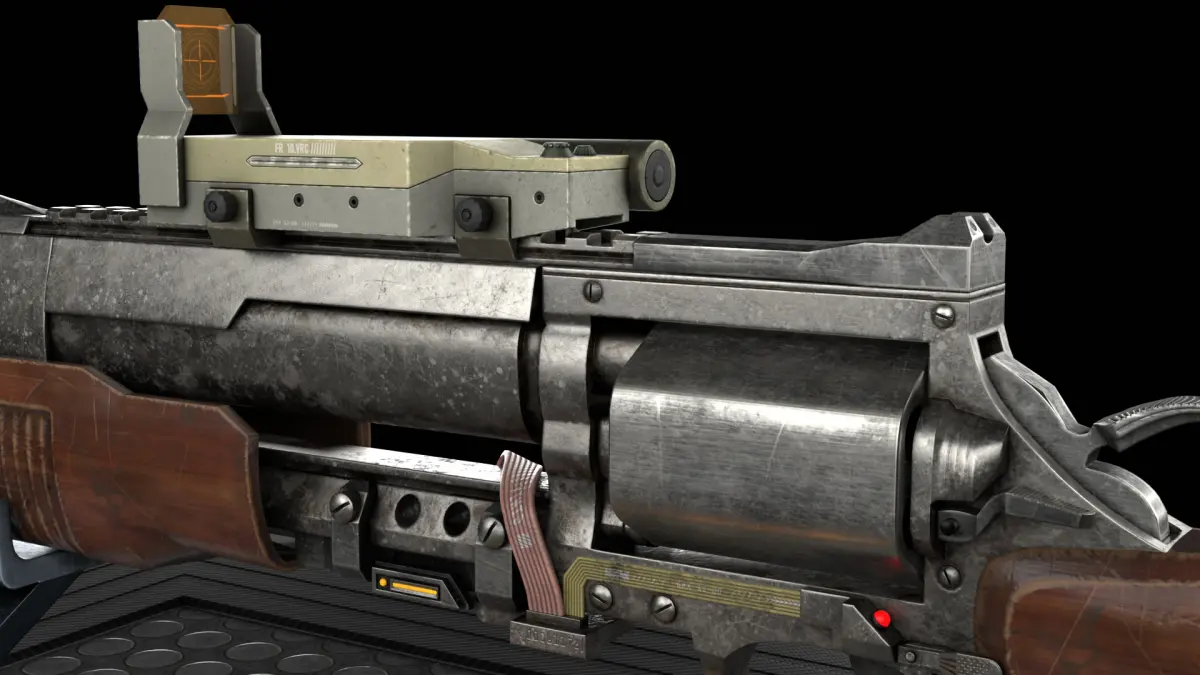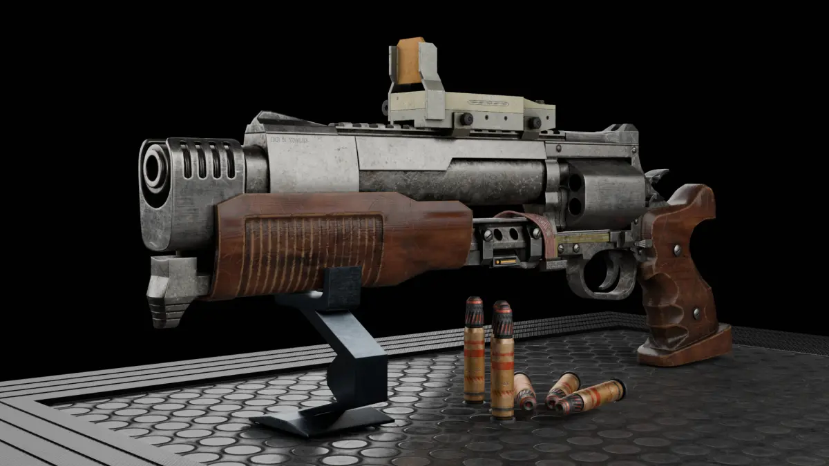 A high-quality 3D model of a sci-fi revolver pistol, blending retro mechanics with futuristic aesthetics. This concept weapon features a chunky, industrial-style revolver chamber, sleek angular frame, and glowing energy lines that run along the barrel and grip. The materials are a mix of brushed metal, composite alloys, and plasma-conducting elements, giving it a rugged yet advanced look.
