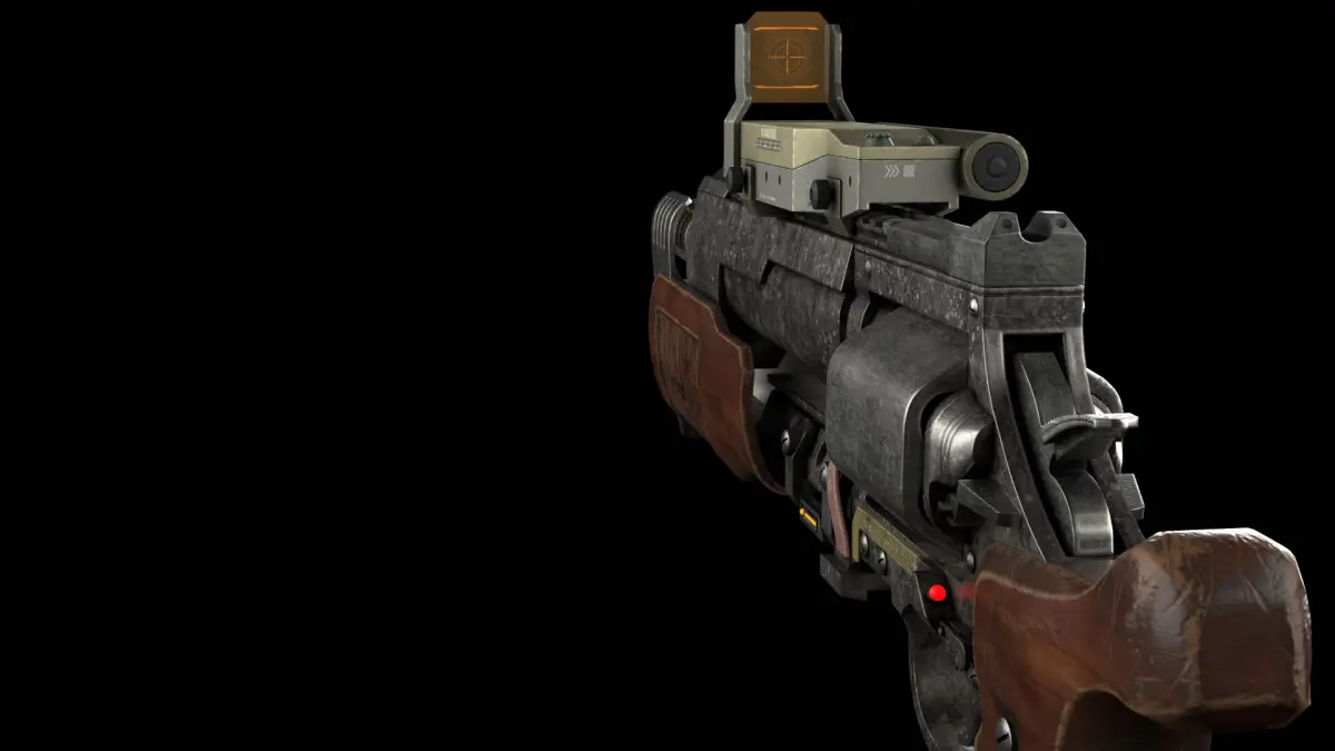 The design supports both ballistic rounds and energy discharge mode, indicated by small tech details like digital readouts and power cores embedded near the grip. Perfect for use in sci-fi games, films, VR, or concept art projects.