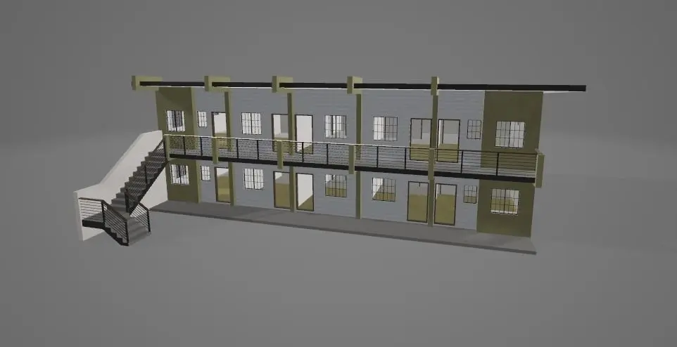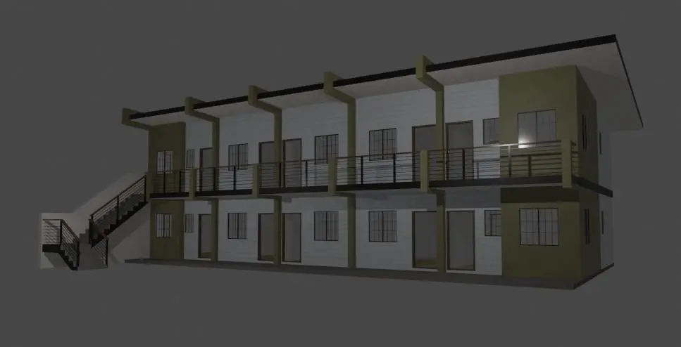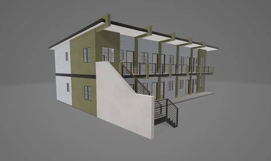 This small bi-level studio apartment complex features 10 enterable units. There are two room styles: Both are technically ony two rooms, but one is slightly larger and has room for a full kitchen, while the other only has room for a small kitchenette. Both have bathrooms large enough to fit a toilet, sink, and a shower or tub. There are 4 of the larger rooms and 6 of the smaller.
