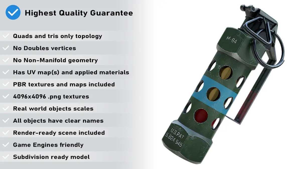 High quality low poly game and render ready model of the Flashbang Grenade PBR. Ready for realtime scenes and game engines;