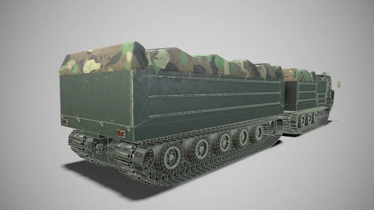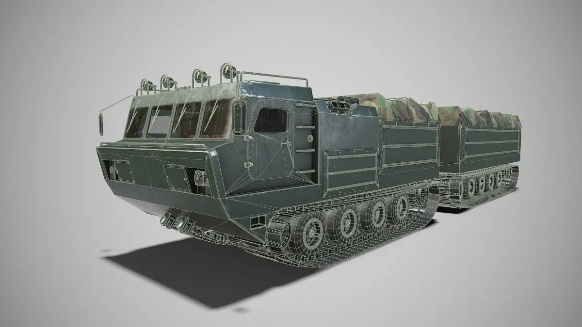 3D model military SUV DT-10.The archive includes a model, two LODs, two sets of textures (2048x2048 MetRoug). Format files; blend, fbx, obj.Divided wheels, doors, hatches, tarpaulin, tracks. In the original blender file, version 2.78, there is a bonus in the form of an animation of the movement of tracks and wheels. The model is compatible with Unity, Godot, Unreal engine.The model is ready for visualization and game projects.