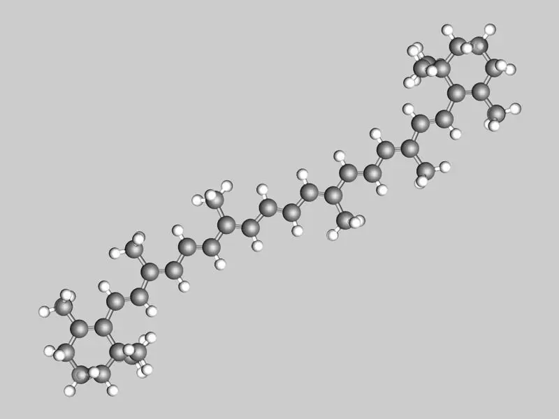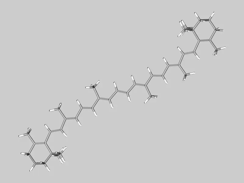 Carotenes are unsaturated hydrocarbons with the formula C40Hx. They occur naturally in plants but (with few exceptions) not in animals. Carotenes are important for photosynthesis. They absorb uv and blue light and scatter orange / red light. Carotenes are responsible for the orange colour of carrots and many other fruits & vegetables, e.g. sweet potatoes.