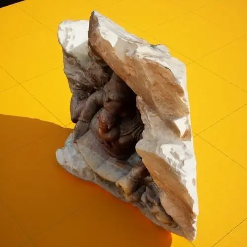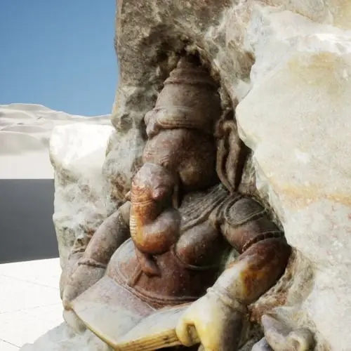 Ganesha is known for being the son of Shiva and Ganga and the brother of Karthikeya. He is a widely popular god in India, especially in the southern region, where you can find a Ganesh sculpture in front of almost every house. It is believed that having a Ganesh sculpture in your home or workplace brings good luck and prosperity. This 3D model of a Ganesh sculpture is intricately designed, featuring the rough and raw texture of the redish, brown, and white marble used to mold it. The Ganesh sculpture is neatly polished and stands at 20 cm in height and 30 cm in width.