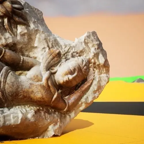 On the other side of this sculpture is a Shiva statue, known as the destroyer and one of the three prominent gods in Hindu mythology. Shiva has three eyes and is often represented with a snake around his neck. This 3D model of a Shiva sculpture also features intricate details and the rough texture of marble, making it a unique piece to add to your collection.