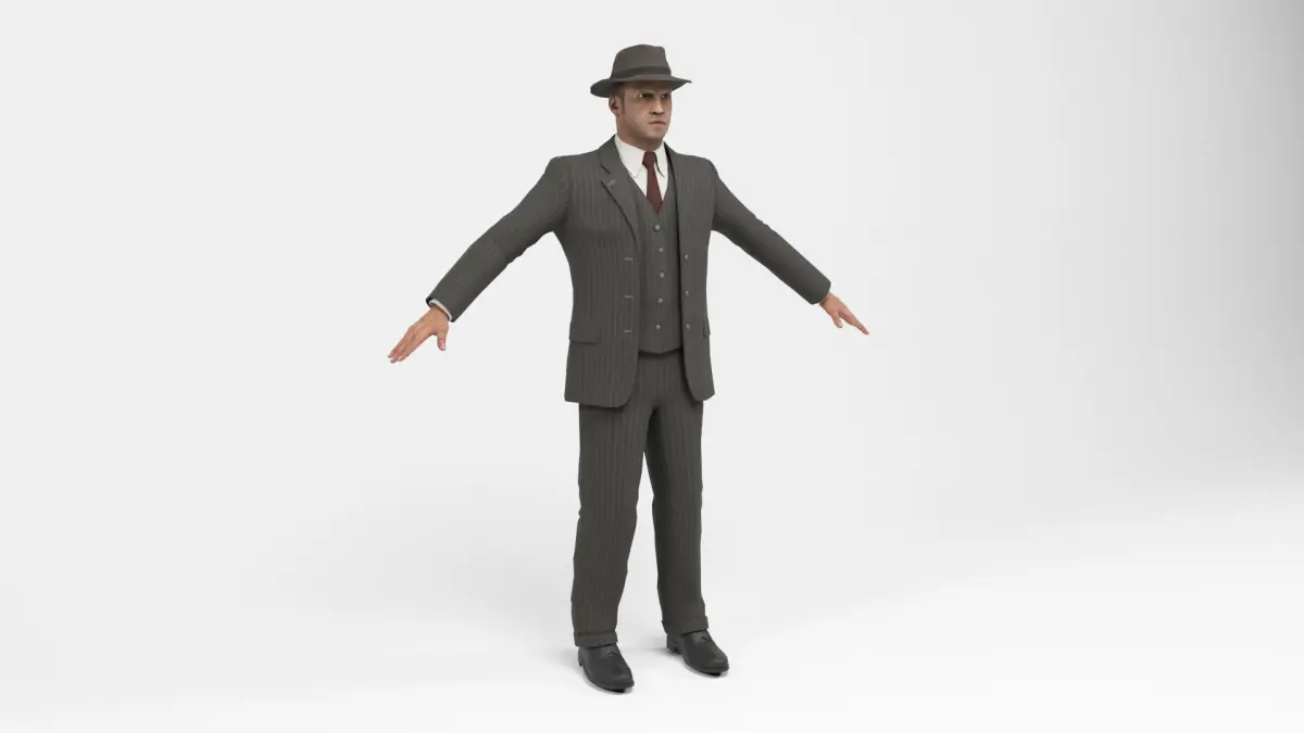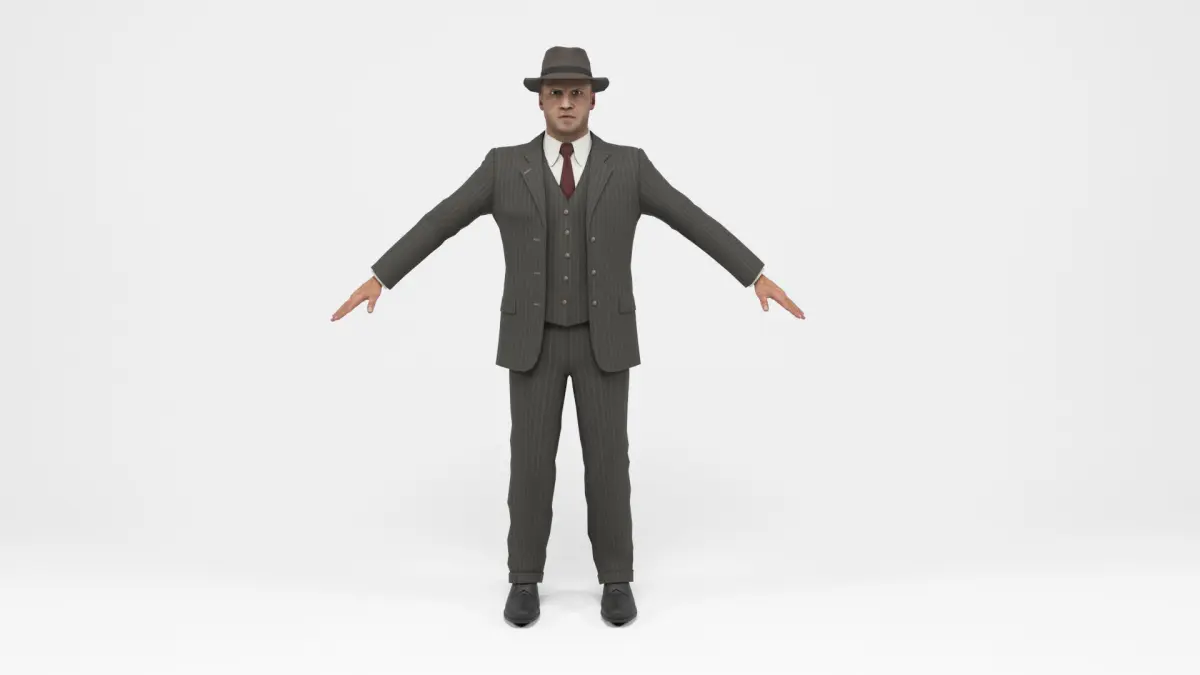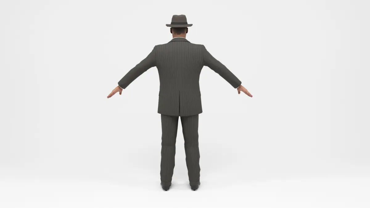 3D model of Gangster with suit and hat. Thompson weapon included. The model includes bones and several animations. Model ideal to be used in games, advertising and video production. Low-poly models to be used easily in any project.