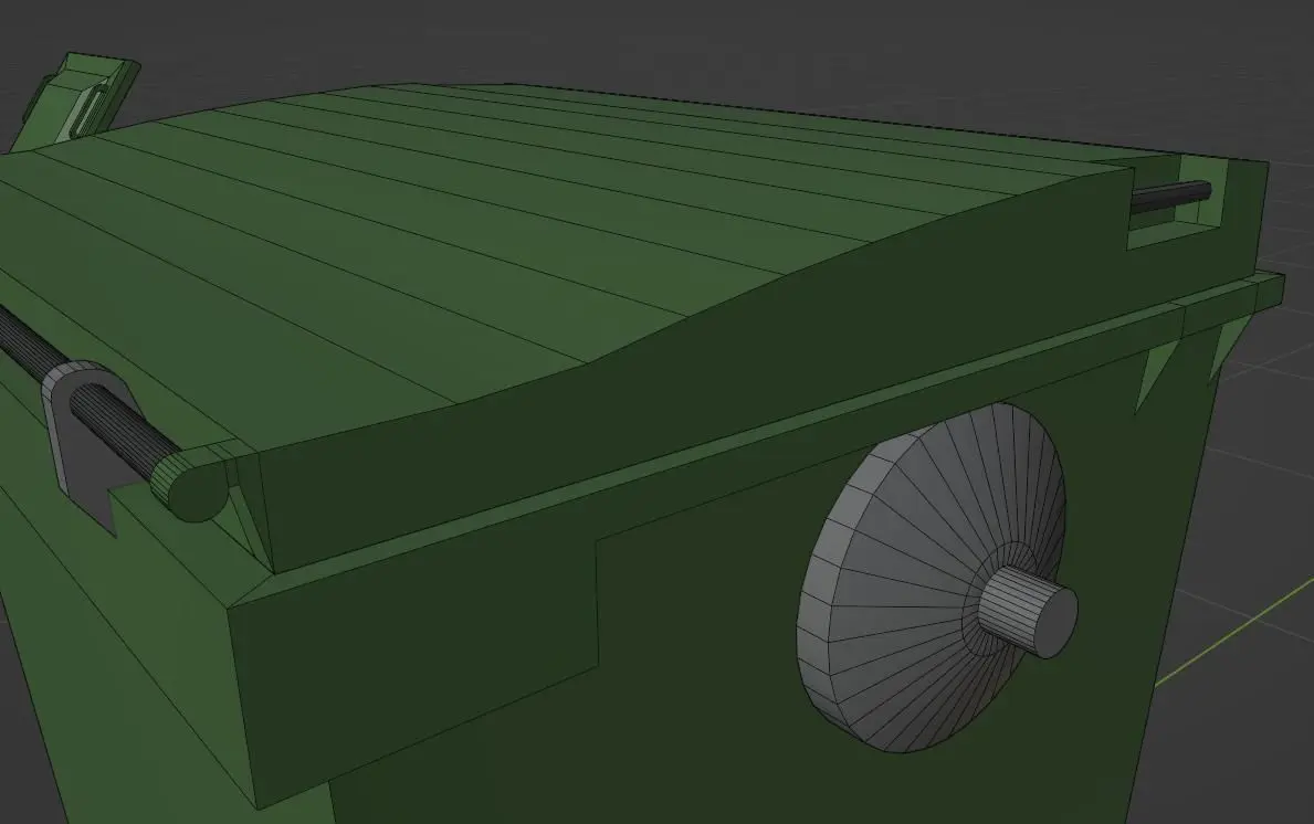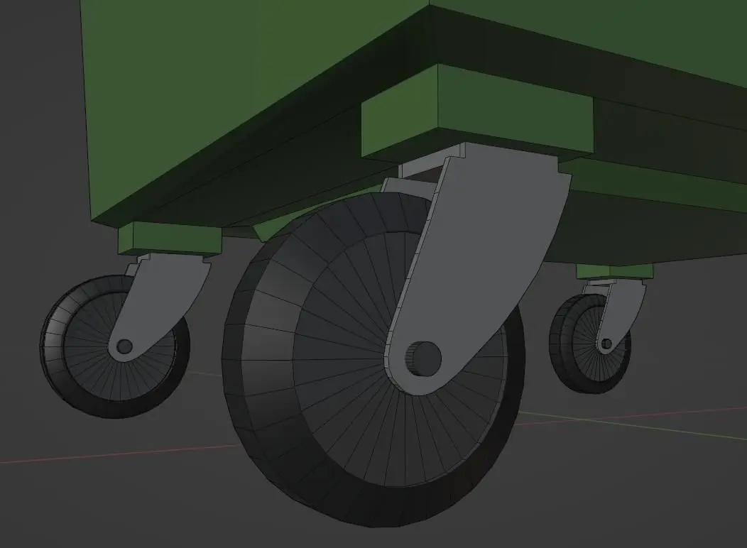 Each model has separate objects: Lid centered on rotation axis to open;Wheels centered on rotation axix;The 1100 L has wheel guides centered on rotation axis to turn.