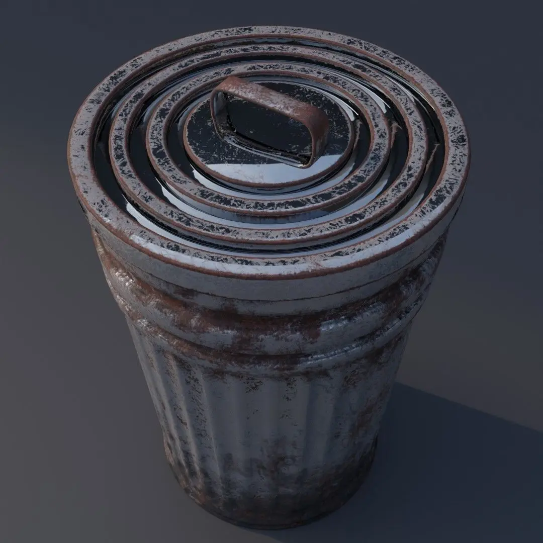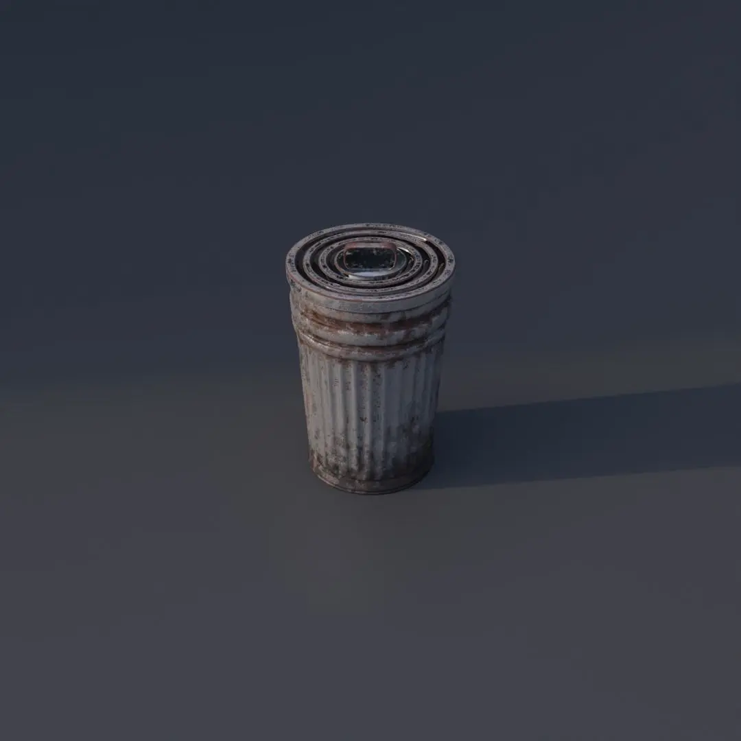 3d model of garbage can, low poly, game ready. Textures (Base color, roughness, AO, metallic, normal map). The can and the lid are separated in different materials. Roughness, AO, and Metalic merged into one RGB texture. R - AO, G - Roughness, B - Metallic. UV unwrapped, no overlaps. Size: - Height: 0.8 m - Width: 0.5 m - Vertex count: 6.639 - Faces count: 6.505I hope you would like it. Thank you.