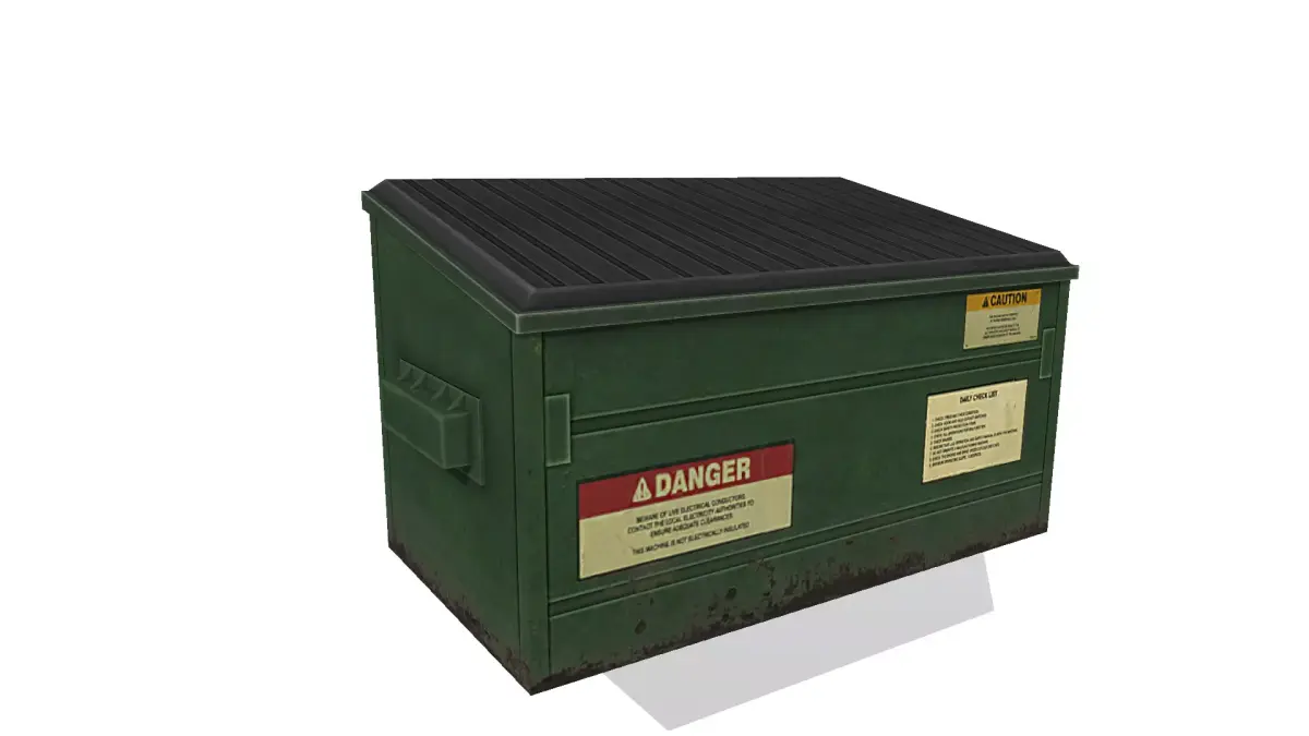 Optimized for real-time rendering, the garbage container is available in both clean and damaged versions for added variety.