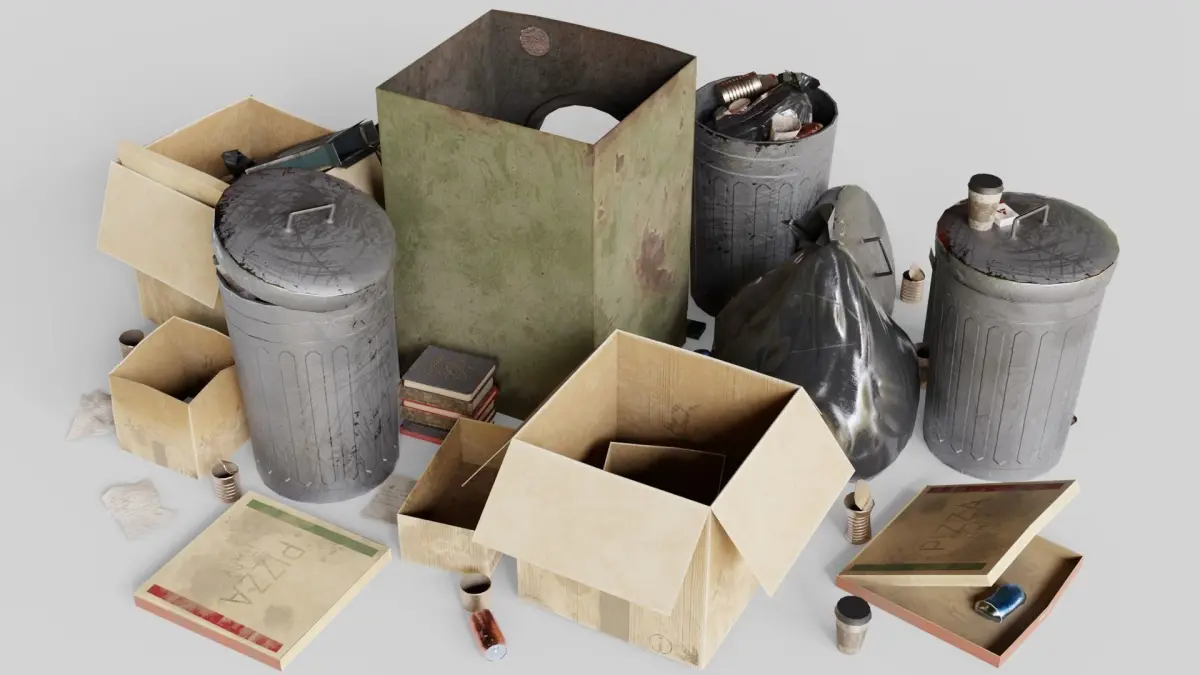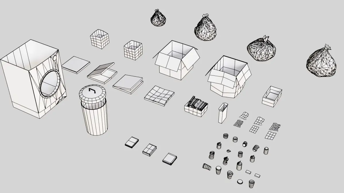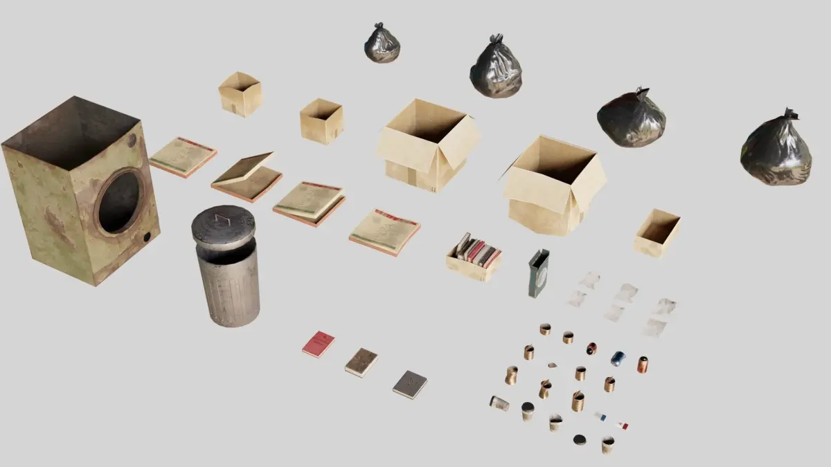 Pack contain 46 different objects (Cardboard Boxes, Garbage bags, Trash bin, Washing machine, Books, Crumpled papers)