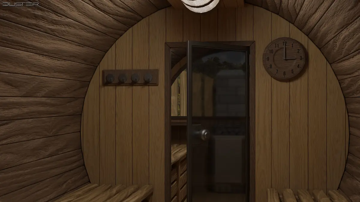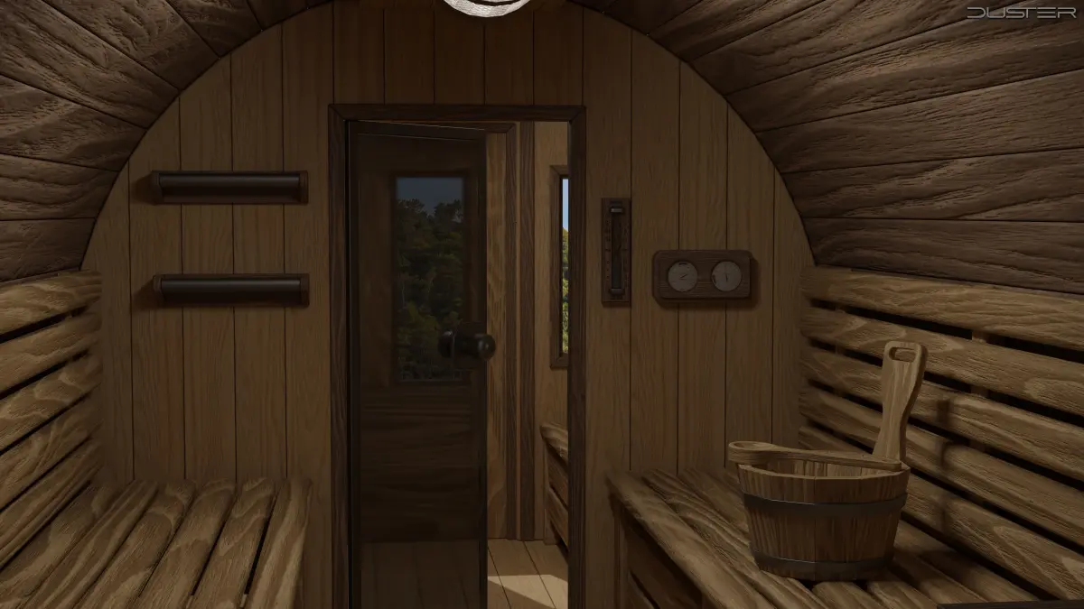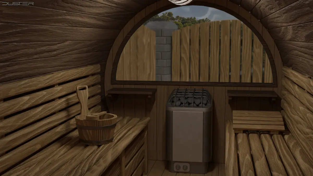 A 3D model of a wooden garden barrel sauna with interior. Created and textured in Blender, 36K vertices/faces.Flat surfaces are modeled in n-gons, the model was successfully tested in Unity.The set includes the sauna exterior and interior with: lights, internal glass doors, benches, a clock, towel/clothing hangers, a hygrometer/thermometer, sand timer, an electric heater, a bucket with a ladle and a headrest.Available formats: BLEND, FBX, OBJ, GLB.