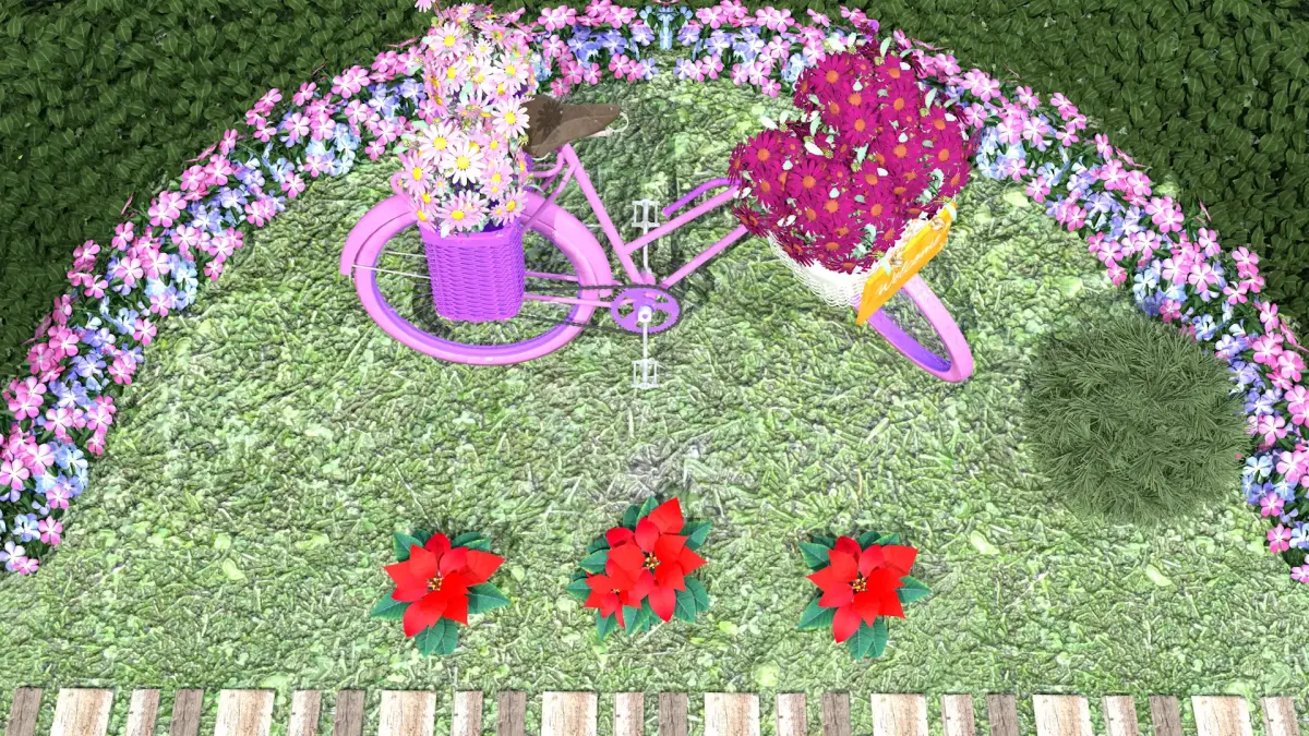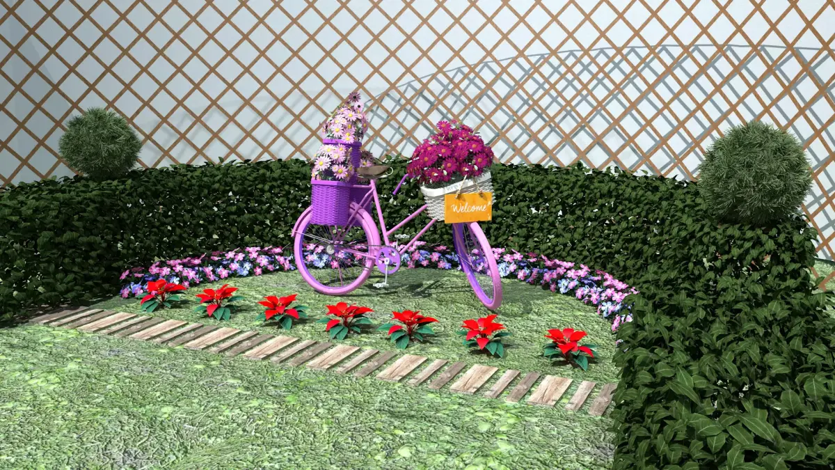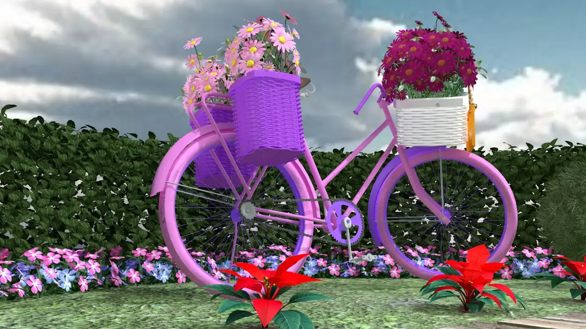 Garden Bicycle 50s made in Cinema 4D R19 in polygonal mesh and exported to fbx, glb files.The textures are PBR in 2k UV mapping, this item contains color, bump, ao, rough and normal maps.In this item you receive a 1950s bicycle, painted in flower tones with 3 flower baskets. The flowers are buds, leaves and two sizes of flowers. A wall formation with the golden dewdrop plant in a half-moon shape, accompanied at its base on the ground by vinca flowers of 3 colors. A sidewalk assembled with 3 types of wooden logs. 3 red parrot beak plant seedlings, all in PBR and polygons that you can move them and make other layouts. Mounted on a raised and textured grass floor.