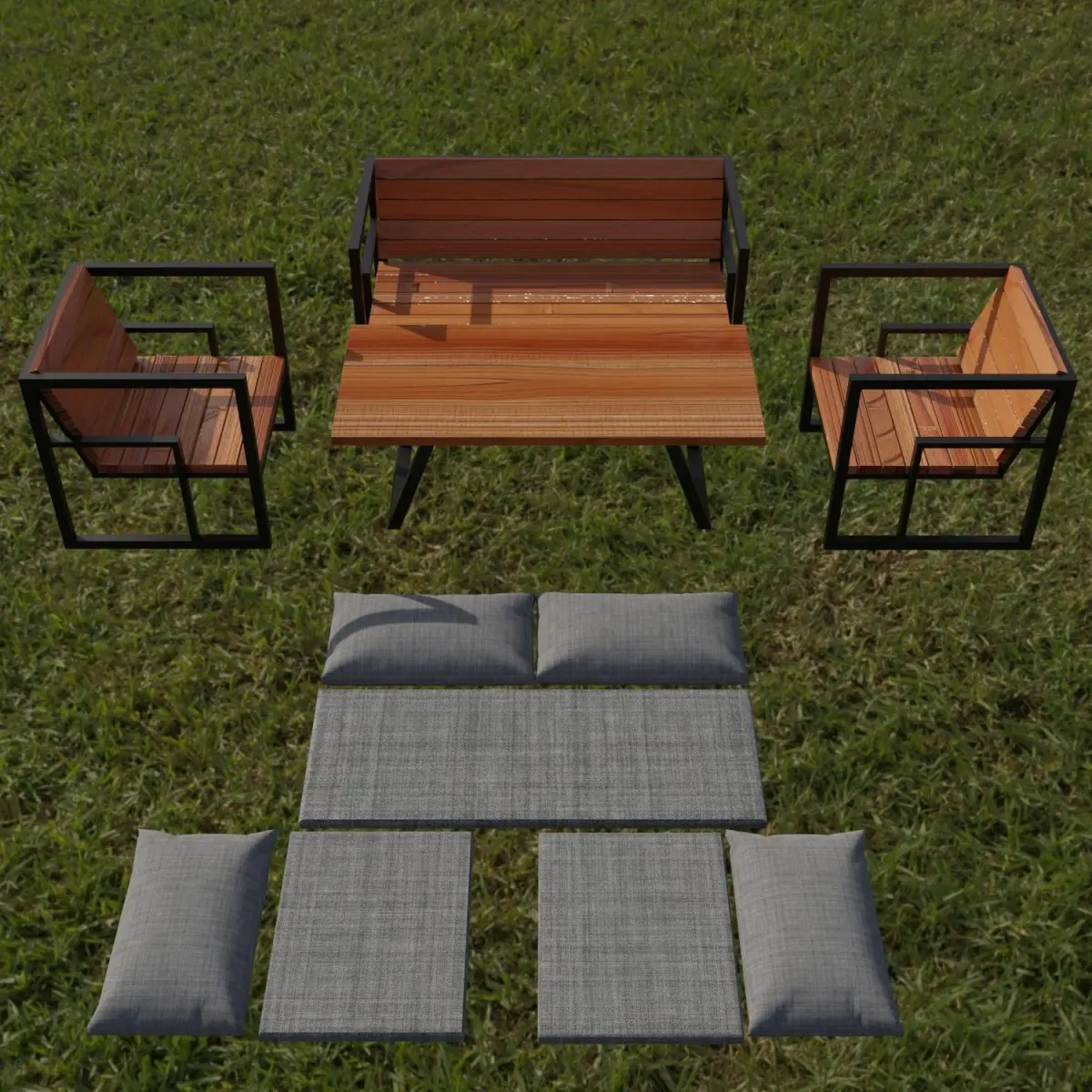 There are many models of garden furniture. The set includes 2 armchairs, 1 sofa, 1 table, a set of soft pillows and a mattress. The bundle also includes a 4092 x 4092px texture pack: Fabric (AO, Base Color, Height, Metallic, Normal, Roughnes) and Wood (Displacement, AO, Base Color, Height, Metallic, Normal, Roughnes). The project itself is in Blender 3D v 3.4.1 format and FBX, OBJ, MTL files, the Substance painter 3d v 8.2.0 project - thanks to which you can get textures of any resolution, as well as easily change color, material, apply any patterns, and so on Further.