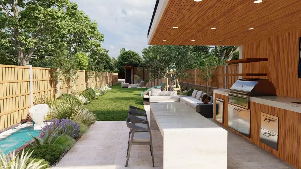 This 3D visualization presents a modern backyard retreat designed for comfort and elegance. The space features a luxurious swimming pool, wooden pergola, and open-air dining area, seamlessly connecting the house to nature.