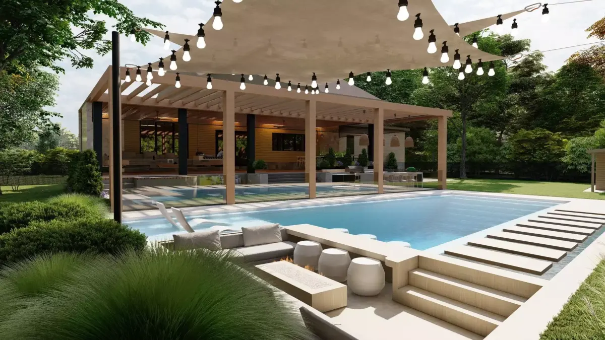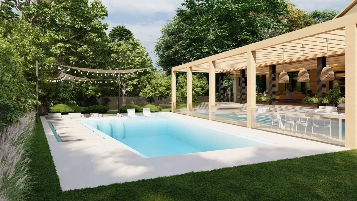 This is a high-quality 3D visualization of a modern private backyard with a luxury swimming pool, pergola lounge, and outdoor dining area. The design features a seamless connection between indoor and outdoor living spaces, highlighted by warm wooden textures, comfortable furniture, and natural greenery.
