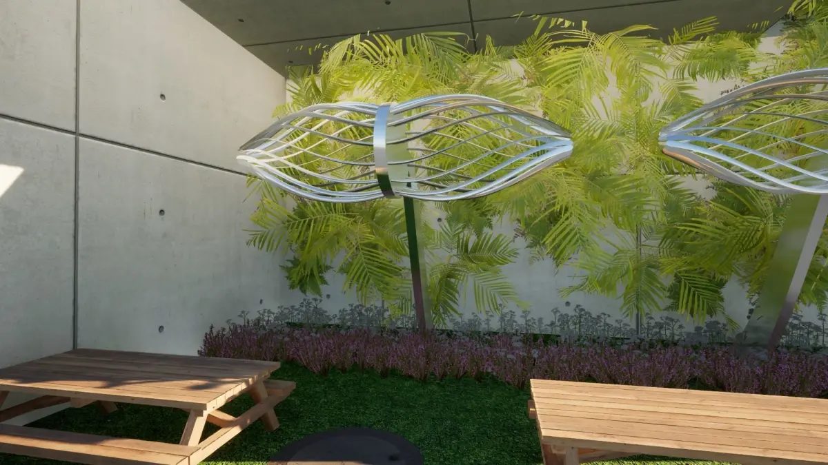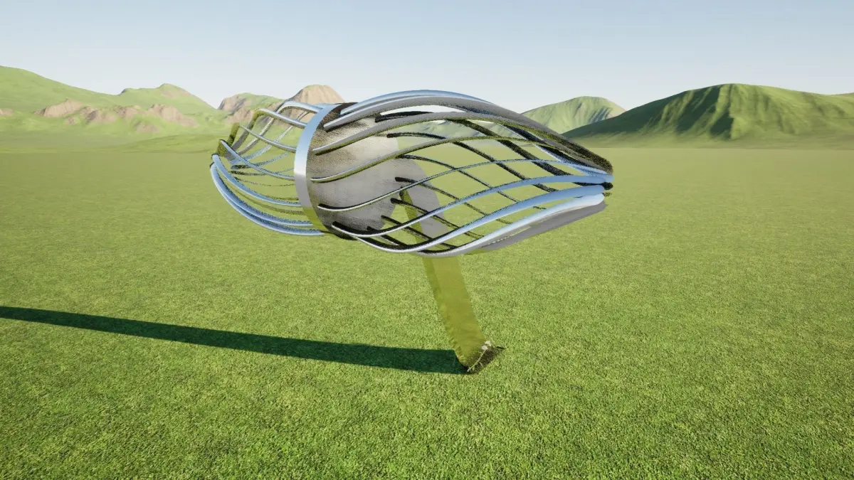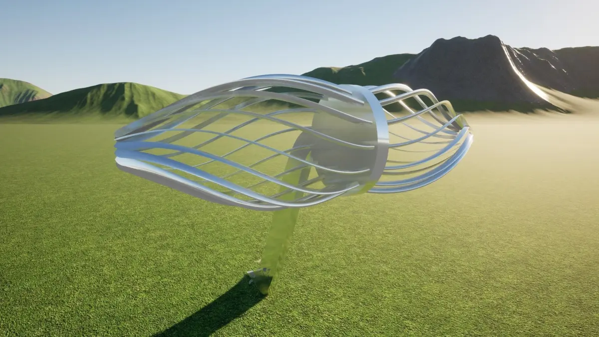 Its placement in an expansive grassy field with hills in the background further accentuates its distinctiveness, suggesting it could serve as a focal point for gatherings, or as an iconic landmark within a larger park or recreational area. This combination of futuristic design and harmony with the landscape makes it both an architectural statement and a potential hub of social interaction.