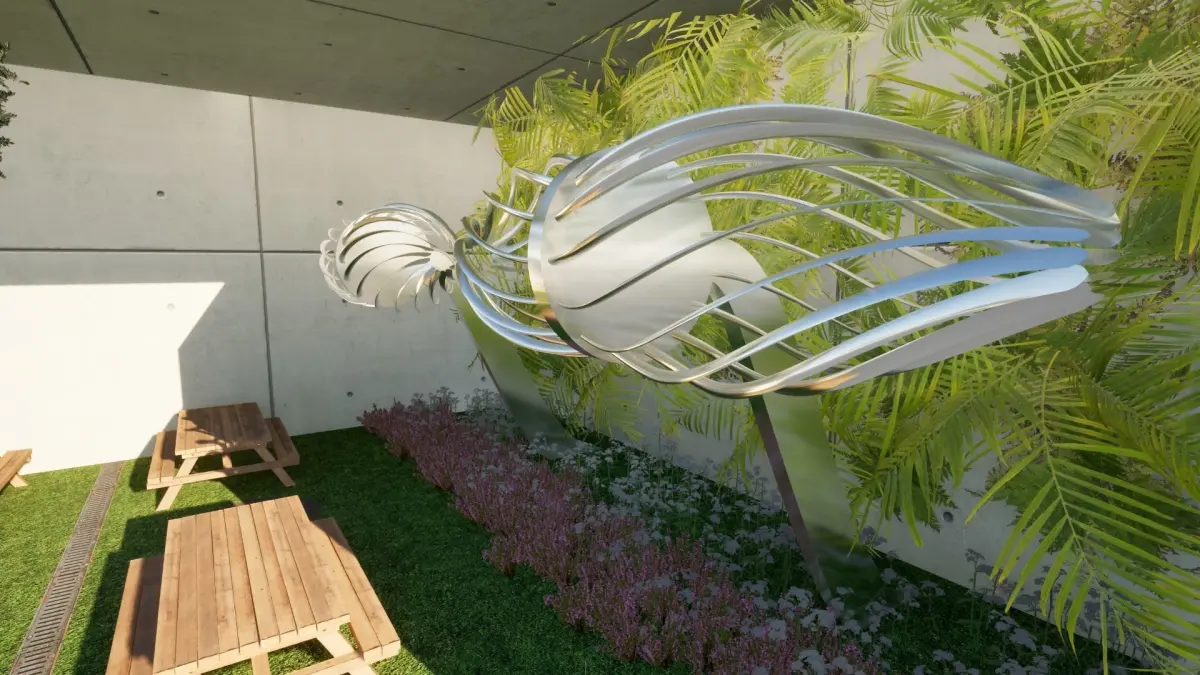 What we have here is a visually striking structure that appears futuristic and organic at the same time. Its form suggests a blend of natural curves and man-made design, creating a sense of movement and fluidity. The skeleton-like frame wraps around what could be a covered space, perhaps serving as an innovative pavilion or a sculptural piece in a public setting.
