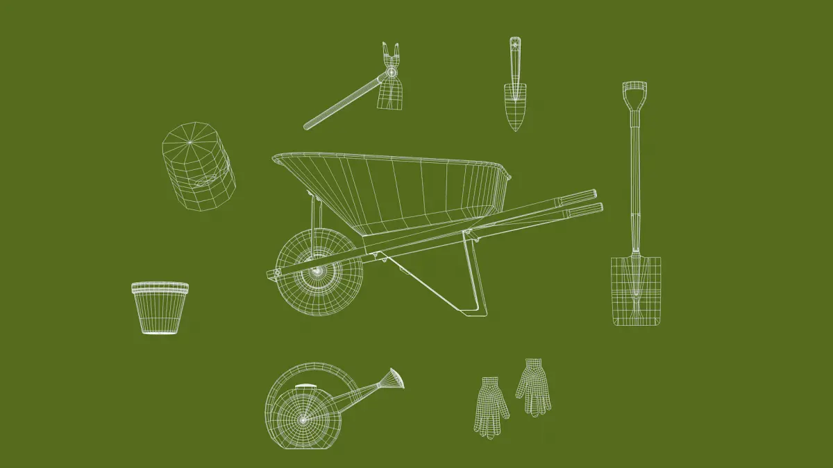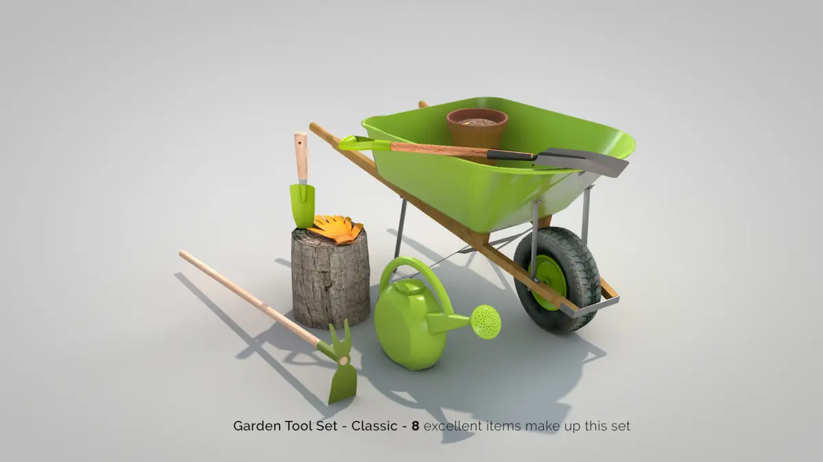 Garden tool set - flower Made in Cinema 4D R19 in polygonal mesh and exported to the files; 3ds, dae, fbx, stl, obj and blend, with uv mapping.The textures are between 4k and 2k on average depending on the size of the object.The set has 8 items; watering can, wheelbarrow, hoe, hand transplanter, shovel, gloves, trunk and vase.I hope you like it and that it is useful in your work.