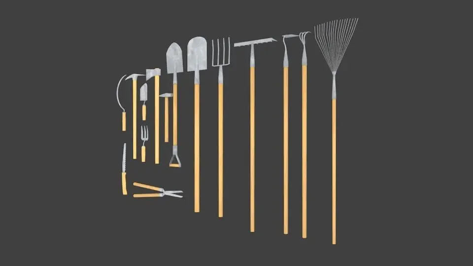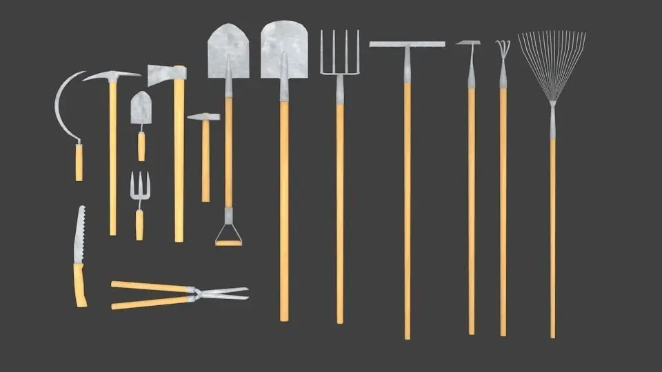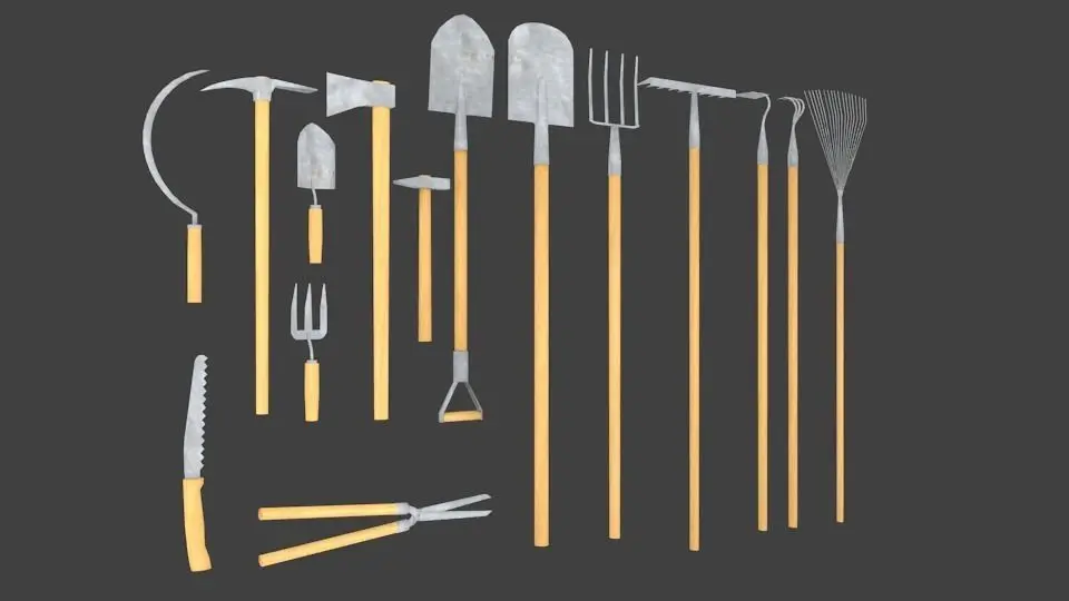 The garden tools set includes 15 models: Axe Sickle Pitchfork Spade Shovel Trowel (2 types) Hoe (2 types) Rake Iron broom Sekateurs Saw Pick Hammer