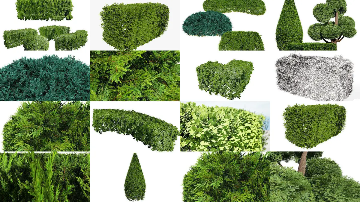 Key Features:• Diverse Shapes and Styles: Includes spherical, conical, cubic, hedged, and natural-looking bush variations, suitable for creating topiary, hedges, and natural shrubbery.