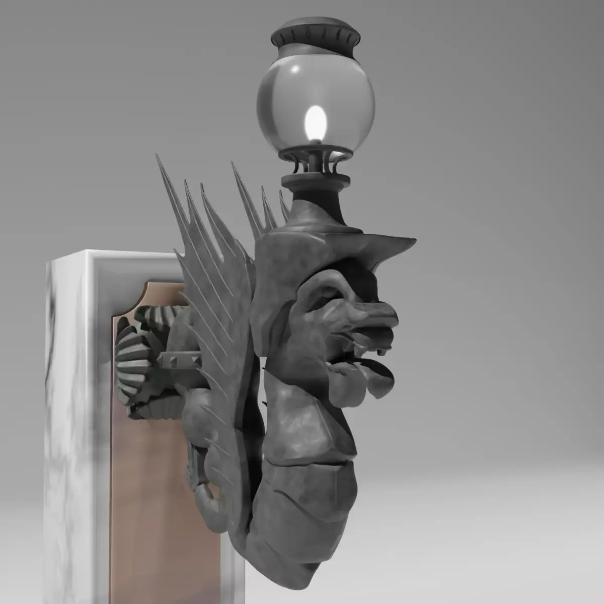 This unique 3D wall gargoyle is designed as a decorative lamp stand. The model depicts a winged fantasy creature, half dragon, half human, sculpted in a medieval Gothic style. It is attached to a textured wall bracket and topped with a lamppost adorned with a glowing globe.